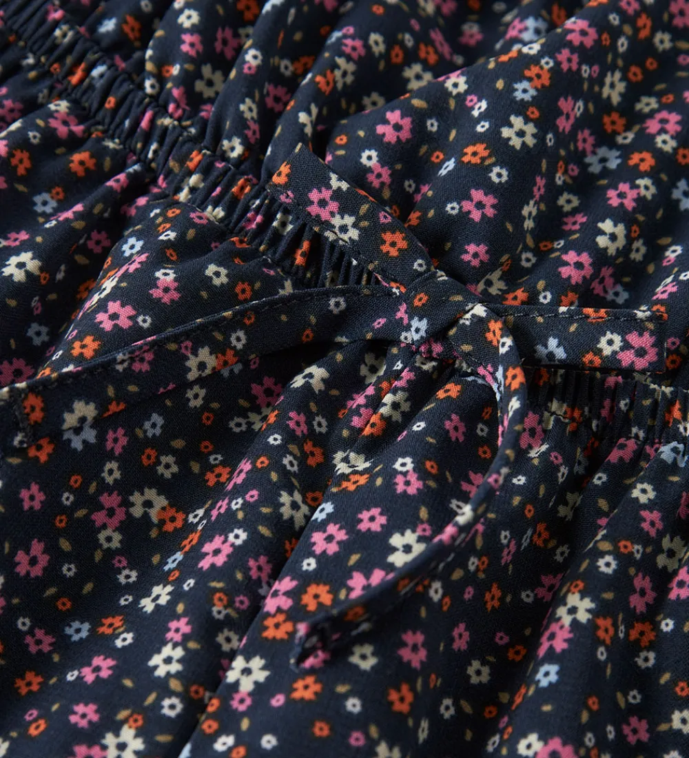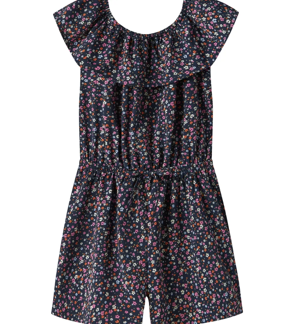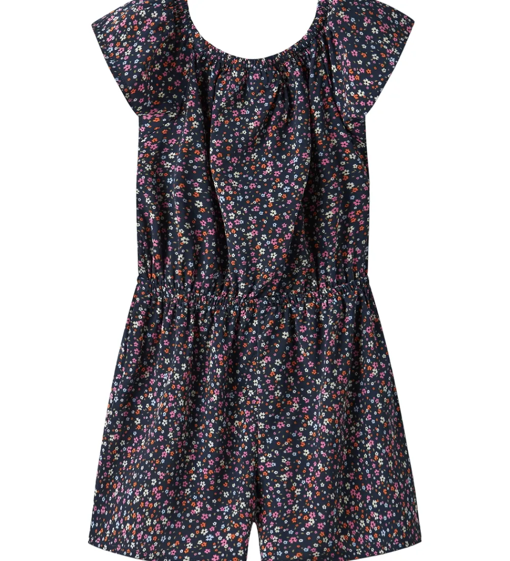 Elegant Name It buksedragt i et farverigt blomsterprint på en mørkeblå baggrund.