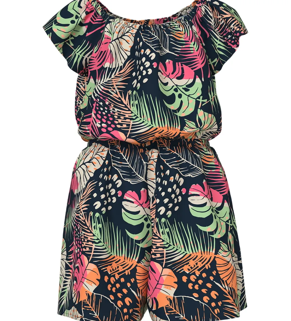 Fremragende Name It buksedragt med et tropisk bladmønster i grønne, pink, orange og beige nuancer på en mørk baggrund.