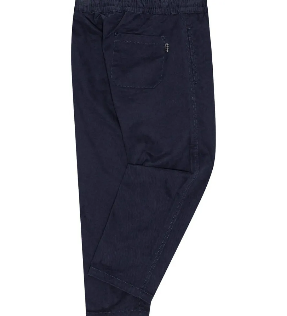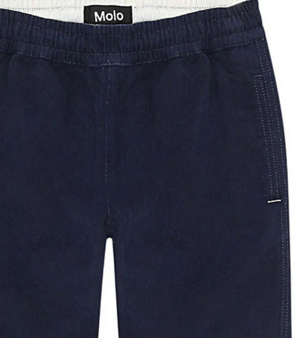 Attraktive bukser fra Molo i en dyb marineblå farve. Molo bukserne har en elastisk talje, som justeres med snore, for en behagelig pasform. Designet fremstår enkelt med lige bukseben. Bukserne har praktiske sidelommer, mens nederste kant er afsluttet uden rib, hvilket giver et rent look. Farven og pasformen gør dem til et alsidigt valg.