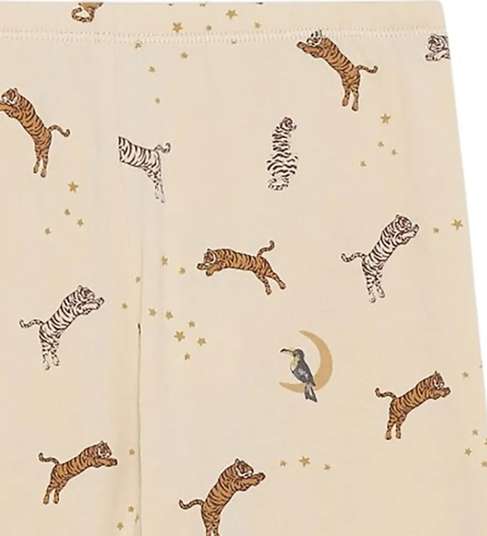 Fine Konges Sløjd bukser i en blød, cremefarvet nuance med et fantasifuldt mønster med forskellige tigerdyr i brune og sorte nuancer samt små stjerner og måner.