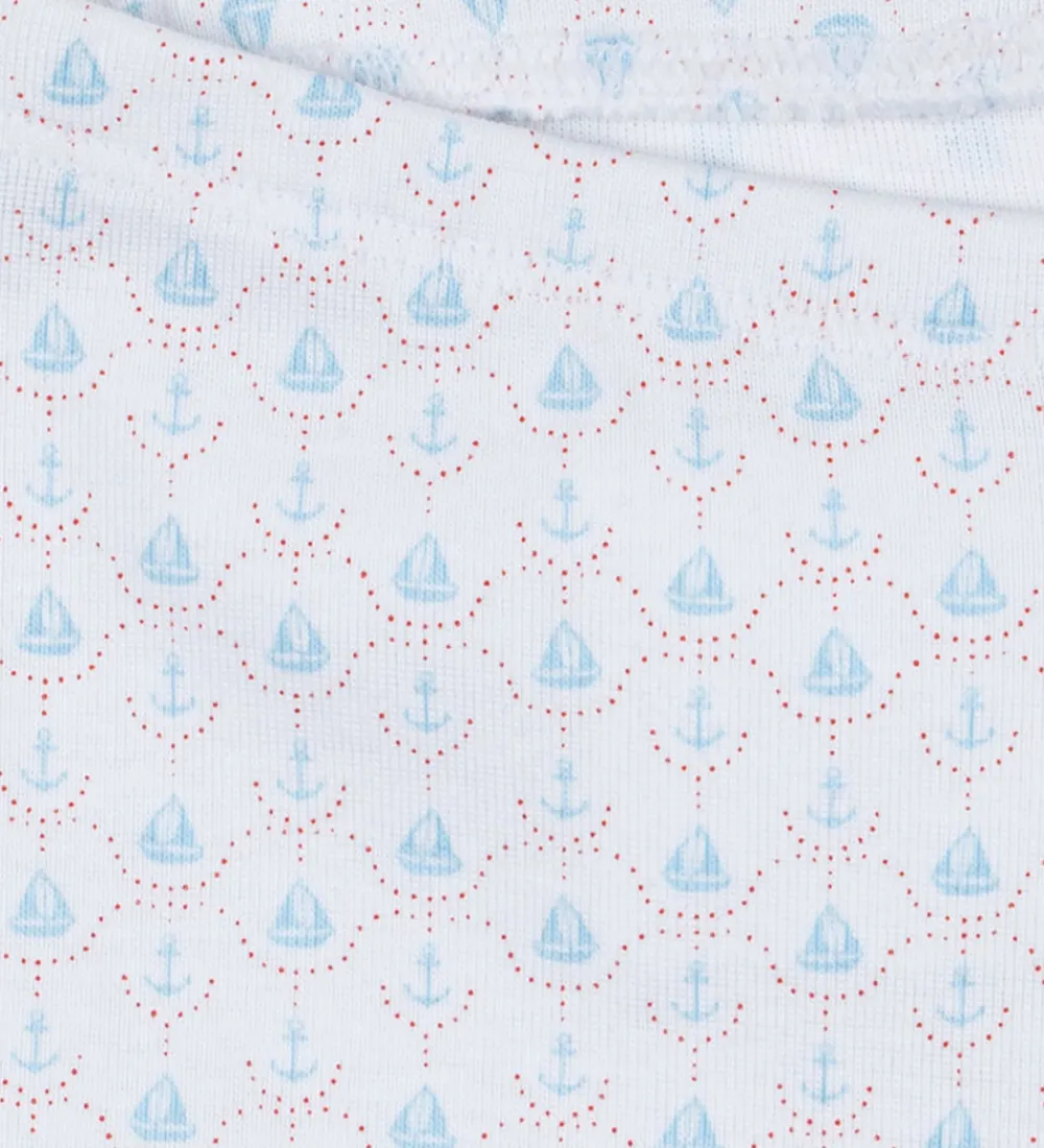 Smukke bukser fra Fanga Fontana i hvid med et delikat mønster af lyseblå sejlbåde og røde prikker. Fanga Fontana bukserne har en blød elastisk talje, der sikrer en behagelig pasform. Buksebenene afsluttes med sømløse kanter, hvilket giver et flot look.