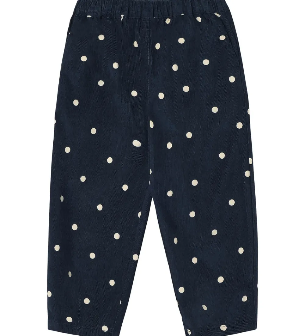 Smarte bukser fra Fliink i mørkeblå fløjl med hvide prikker. Bukserne har en afslappet pasform med brede ben. I taljen er der en god elastik, og øverst er der en praktisk lomme i hver side.