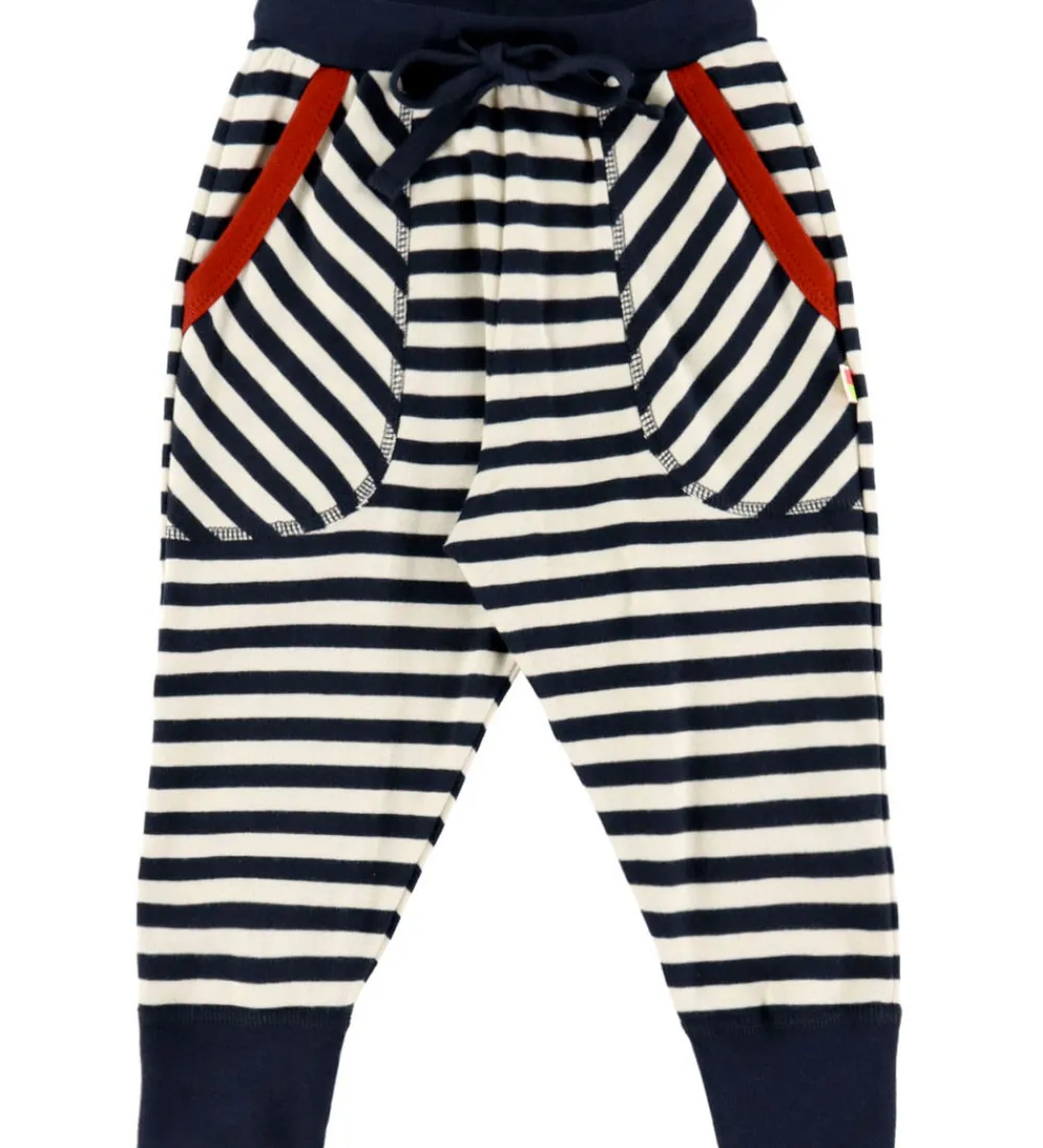 Praktiske bukser fra Katvig med et klassisk, vandret stribemønster i navyblå og hvid. Katvig bukserne har en elastisk talje, som kan justeres med snører. De har to lommer foran med røde kontraststriber øverst. Buksebenene afsluttes med ribkanter, som sikrer en god og tæt pasform.