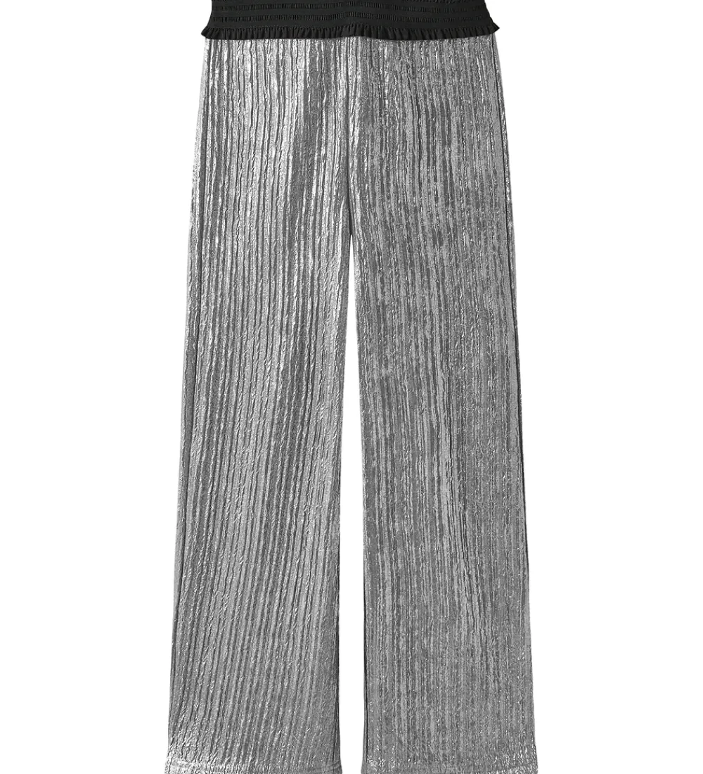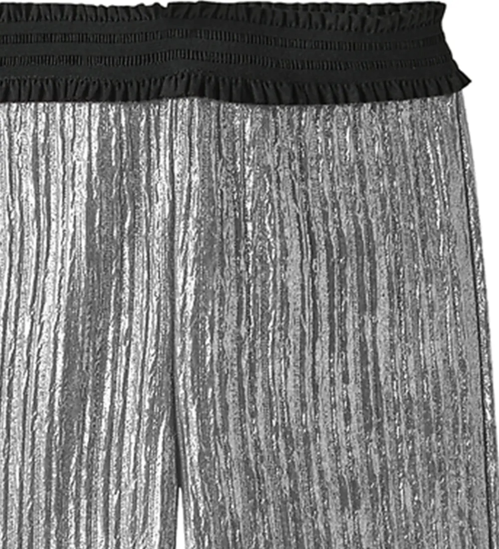 Festlige bukser fra Name It skinnende, metallisk sølv med stribet struktur. Name It bukserne har en bred, sort elastik i taljen, som giver en behagelig pasform. Bukserne har en løs pasform med vidde ben, der skaber et moderne look.