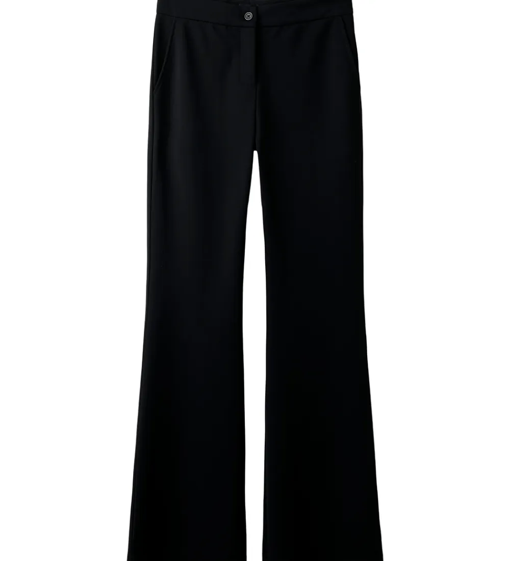Stilfulde bukser fra LMTD i sort. LMTD bukserne har et enkelt design med en tætsiddende pasform omkring lårene og vidde ved anklerne. Bukserne har elastisk talje, som kan justeres med knapper indvendigt. De lukkes foran med en knap og lynlås. Fortil er der to lommer, og bagpå er der to snydelommer.