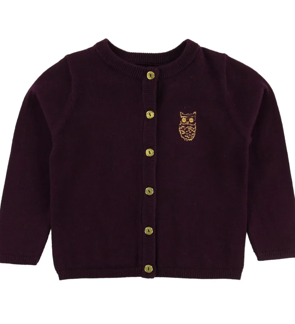 Lækker Soft Gallery cardigan i ensfarvet lilla med fine guld knapper, samt broderi af en guld ugle på venstre bryst.