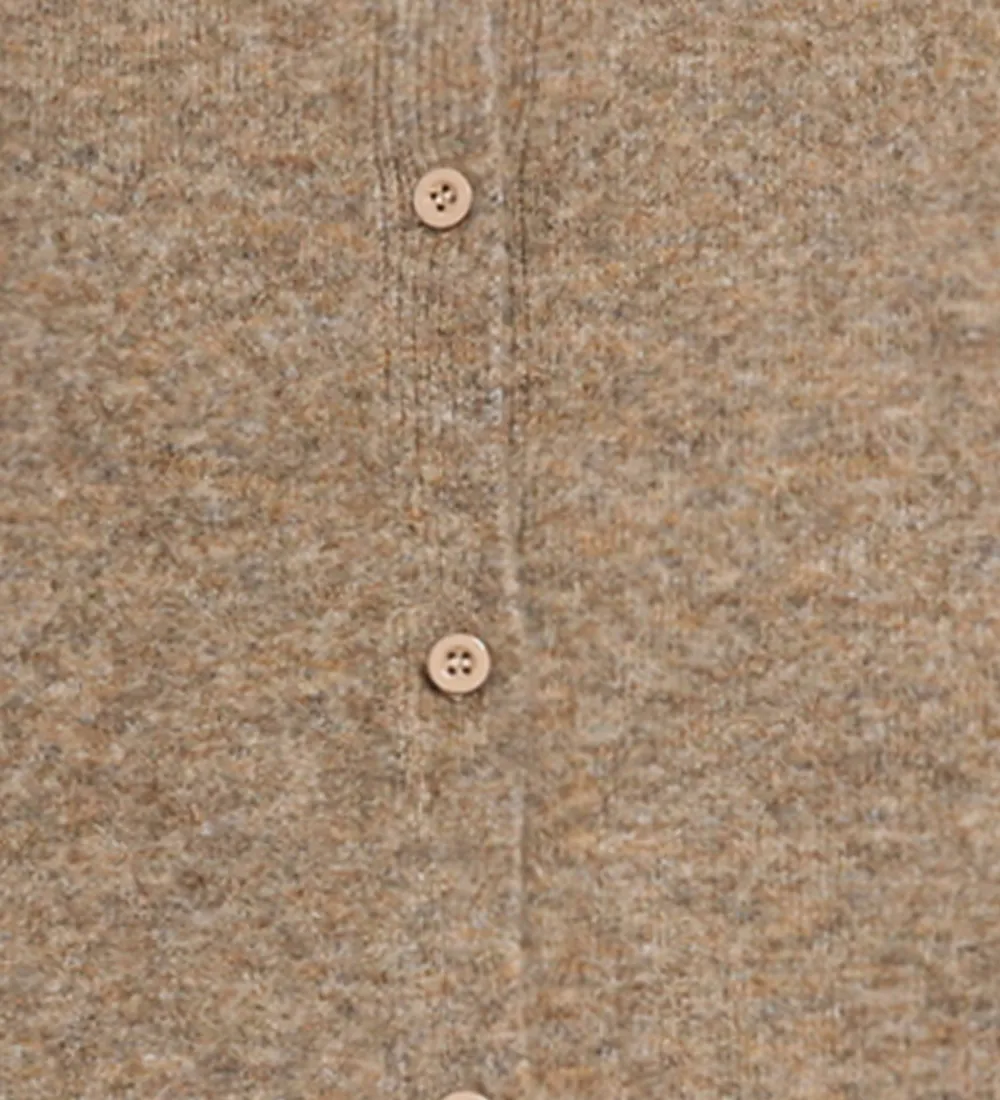 Stilfuld cardigan fra Hound i meleret lysebrun med strikket struktur. Hound cardiganen har en rund halsudskæring og gennemgående knapper foran. Den har smalle ribkanter ved alle åbninger.