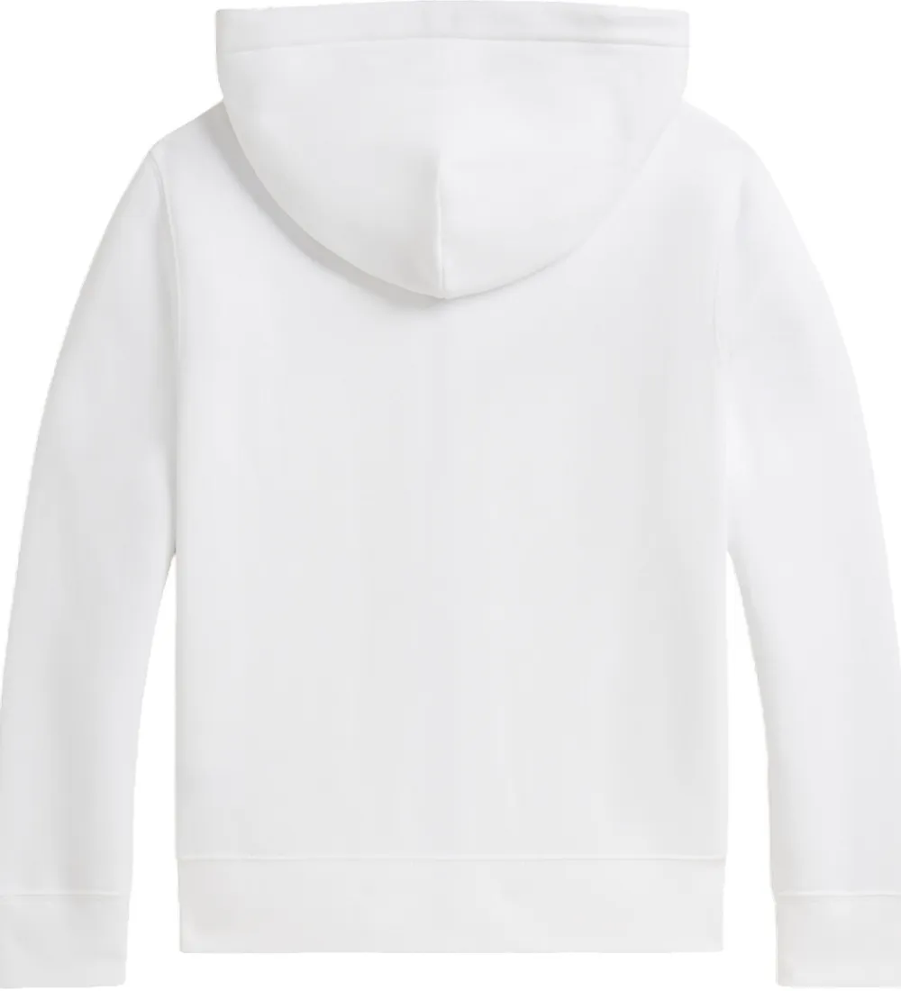 Elegant Polo Ralph Lauren cardigan i hvid sweat med lange ærmer og en praktisk hætte. Cardiganen har en gennemgående lynlås og er udsmykket med det ikoniske Polo Ralph Lauren logo på brystet. Fronten har to store lommer, der giver et funktionelt design. Cardiganen har blødt, børstet bomuld på indersiden.