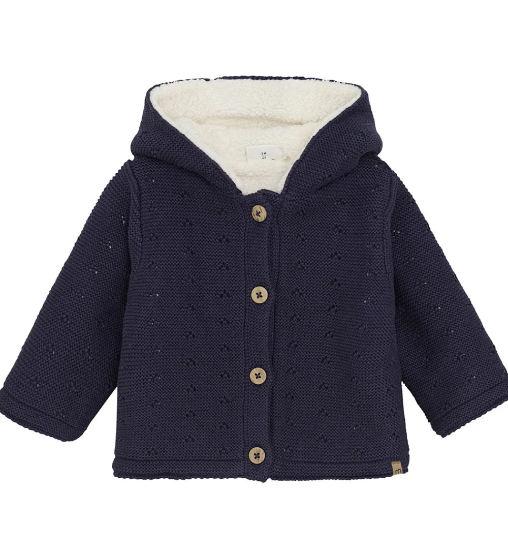 Flot Minymo cardigan i navyblå strik med flot hulmønster. Cardiganen fra Minymo har en fastsyet hætte og lange ærmer. Den lukkes fortil med gennemgående knapper. Indvendigt er der blødt, lyst teddyfleece, som giver god varme.