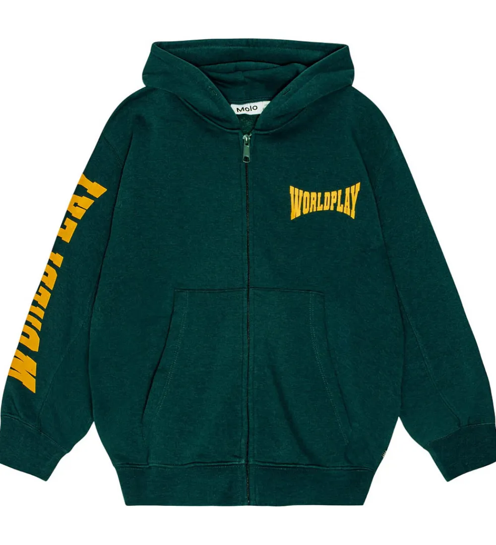 Flot Molo cardigan i en dyb, skovgrøn farve med gule tekstdetaljer. Cardiganen har en praktisk lynlåslukning og rummelige frontlommer. Cardiganen har hætte og lange ærmer, hvor teksten “WORLDPLAY” elegant pryder både brystet og det ene ærme, ligesom teksten findes på ryggen. Molo tilbyder et enkelt og stilrent udtryk med denne cardigan.