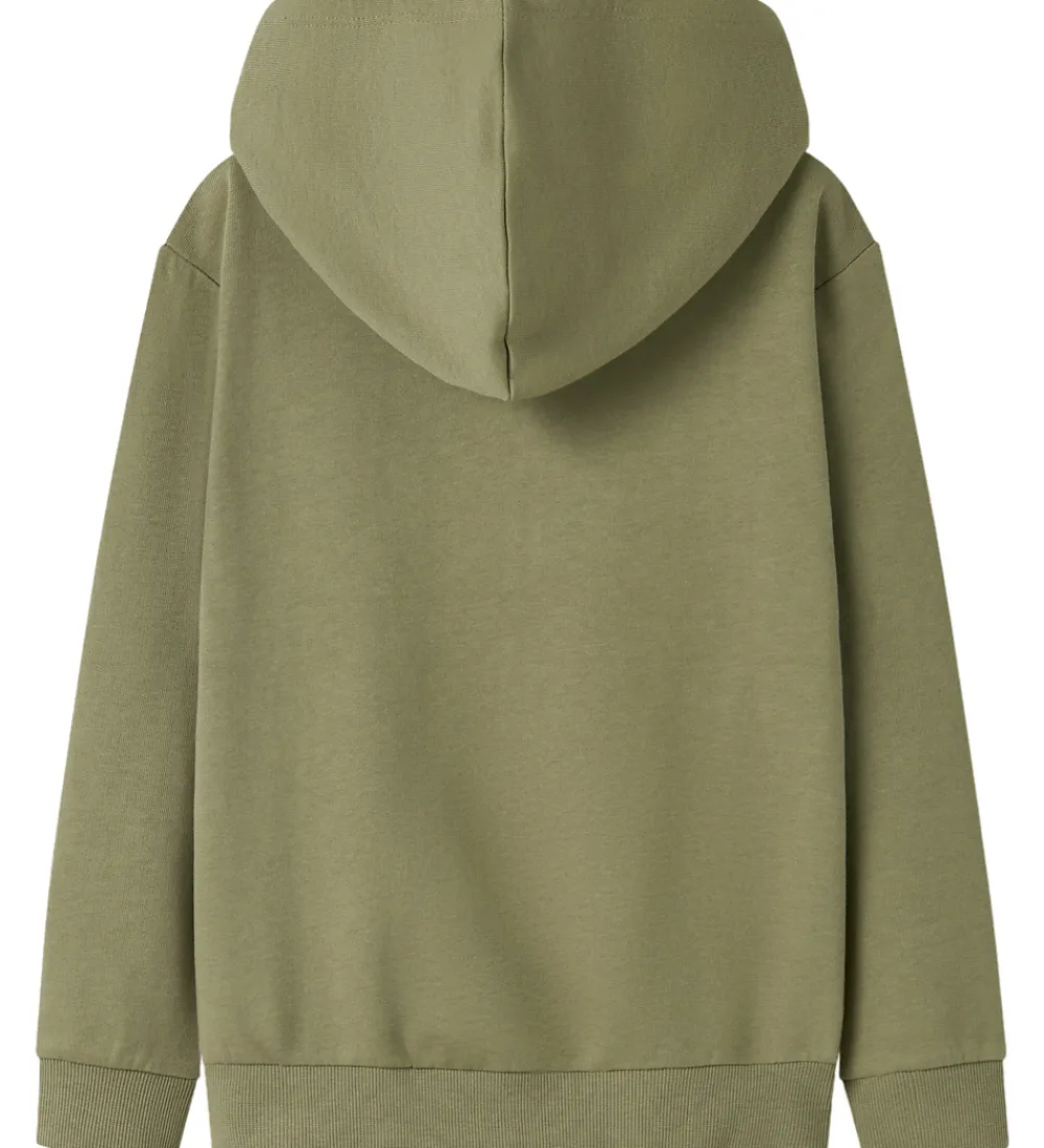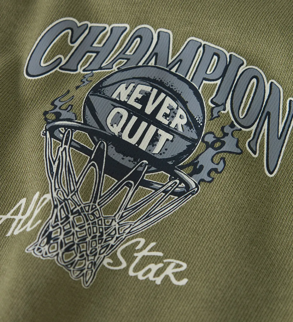 Sej Name It cardigan i olivengrøn med et blåt og hvidt basketballprint på venstre bryst og teksten “Champion, Never Quit, All Star”. Cardiganen er i en lækker sweatkvalitet med en blød hætte og gennemgående lynlås fortil. Indvendigt er der blødt, børstet bomuld.