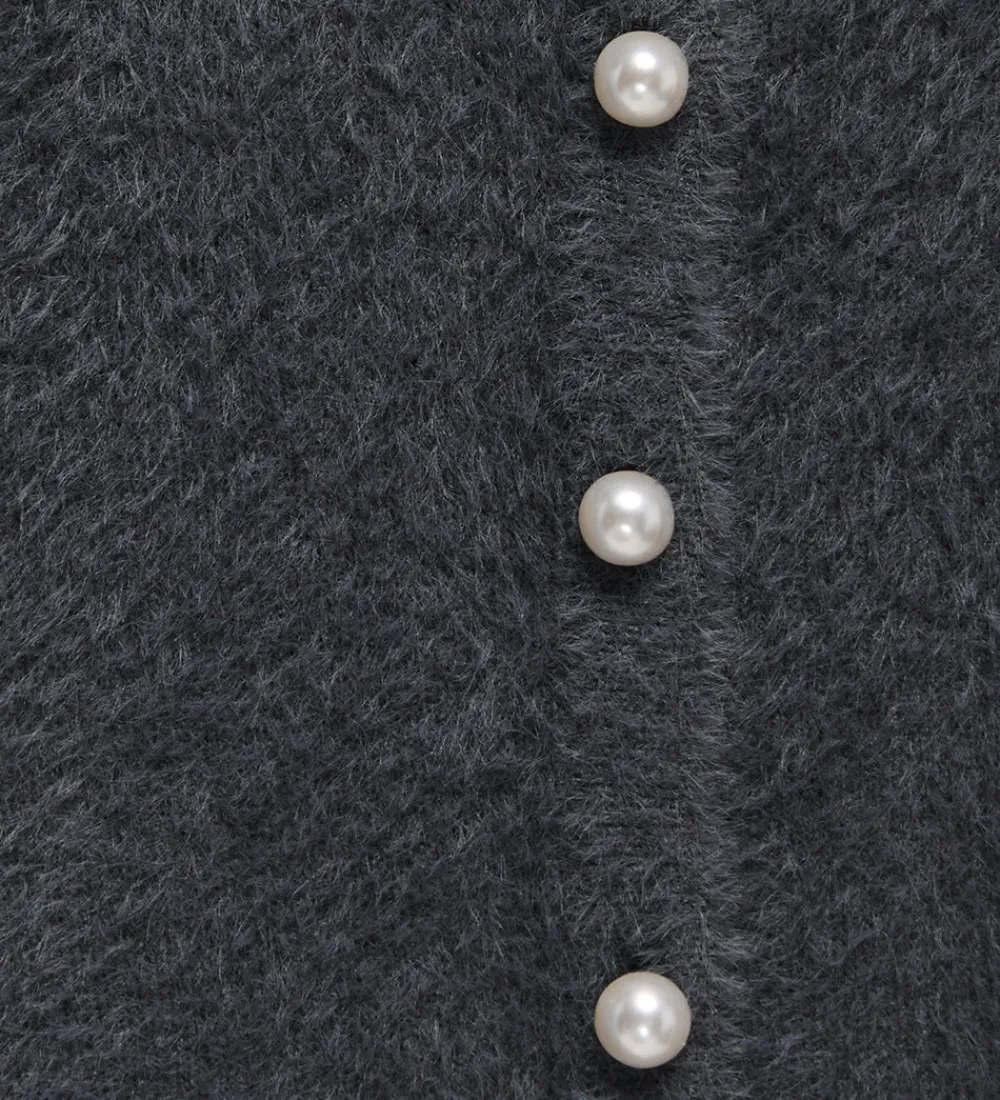 Indbydende cardigan fra Kids Only i en mørk grå nuance med en blød overflade. Cardiganen fra Kids Only har lange ærmer og en rund halsudskæring. De elegante perleknapper giver et stilfuldt udtryk. Designet er enkelt og tidløst, hvilket gør den til et alsidigt valg i garderoben.