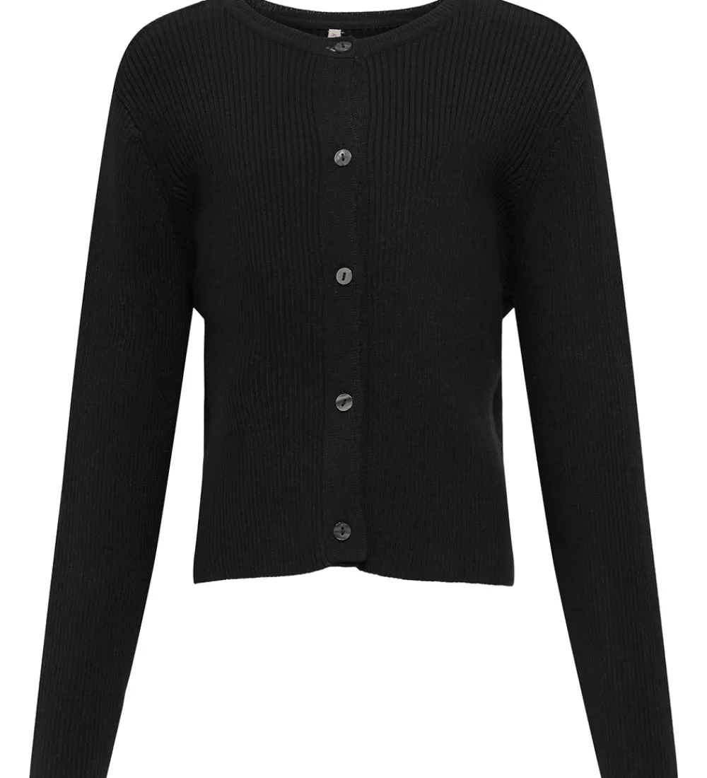 Stilren Kids Only cardigan i sort med lange ærmer og en elegant ribbet struktur. Kids Only cardiganen kommer med en enkel knaplukning foran og en rund halsudskæring, som giver et klassisk look.