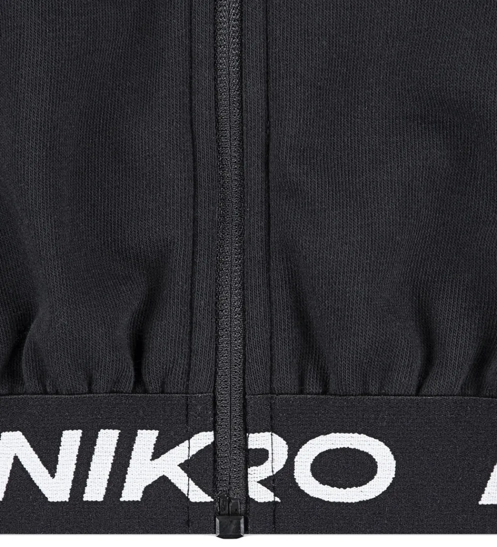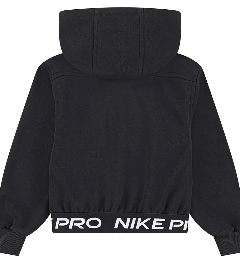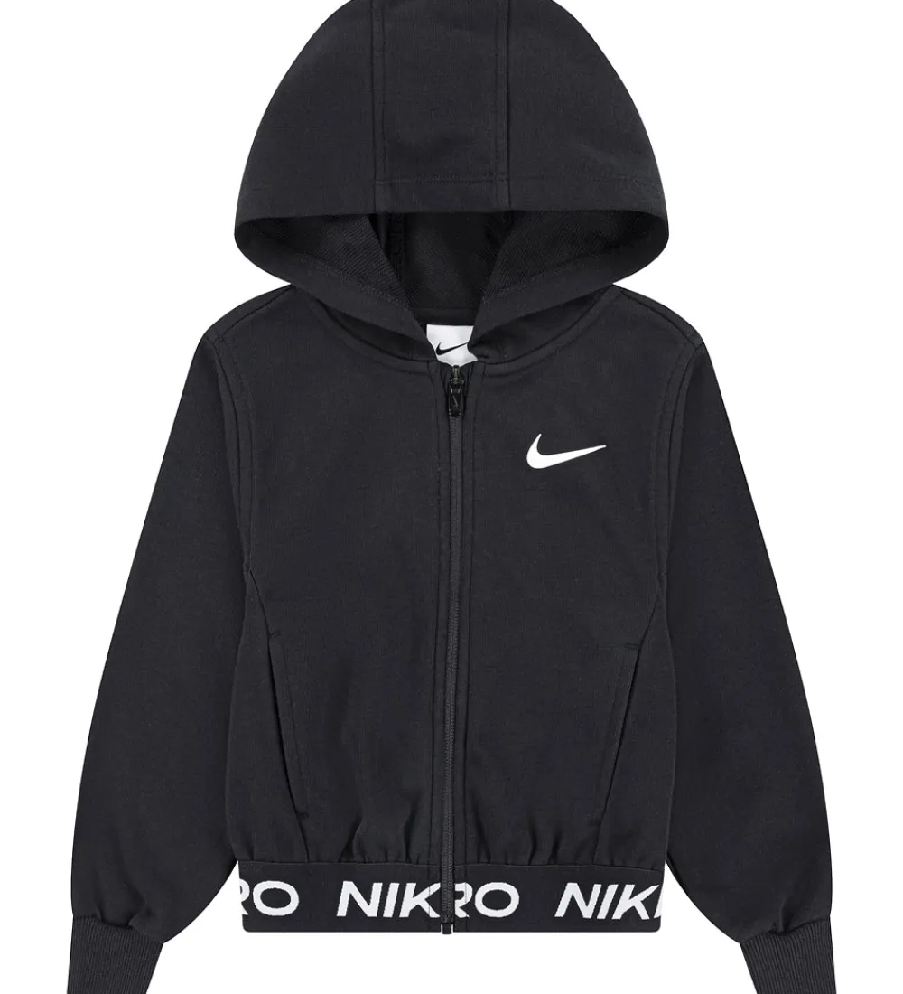 Smart Nike cardigan i sort med et hvidt logoprint på venstre bryst og en sort elastik med teksten “Nike Pro” i hvid nederst. Cardiganen er lavet i sweatkvalitet med en blød hætte og gennemgående lynlås. Den har lange ærmer med ribkanter i ærmeåbningerne og i siderne er der praktiske lommer.