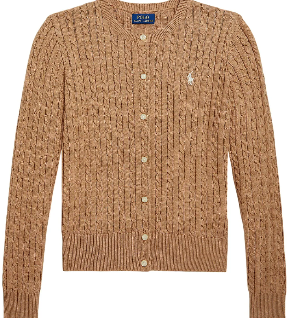Stilfuld cardigan fra Polo Ralph Lauren i ensfarver brun i en strikket kvalitet med et flot, snoet mønster. Cardiganen har lange ærmer. Den er designet med en rund halsudskæring og en gennemgående knaplukning med elegante knapper. Polo Ralph Lauren logoet er diskret placeret på brystet, hvilket giver en tidløs markering.