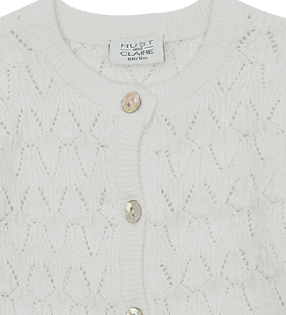 Lækker Hust and Claire cardigan i hvid strik med et flot allover hulmønster samt gennemgående lukning med perlemorsknapper fortil.
