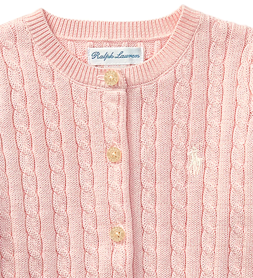 Sød Polo Ralph Lauren cardigan i lys rosa i en strikket bomuldskvalitet med et flot, snoet mønster. Fortil i venstre side er der broderet et lille, hvidt logo.