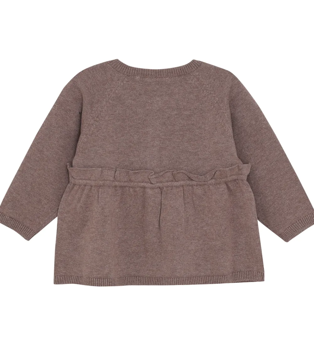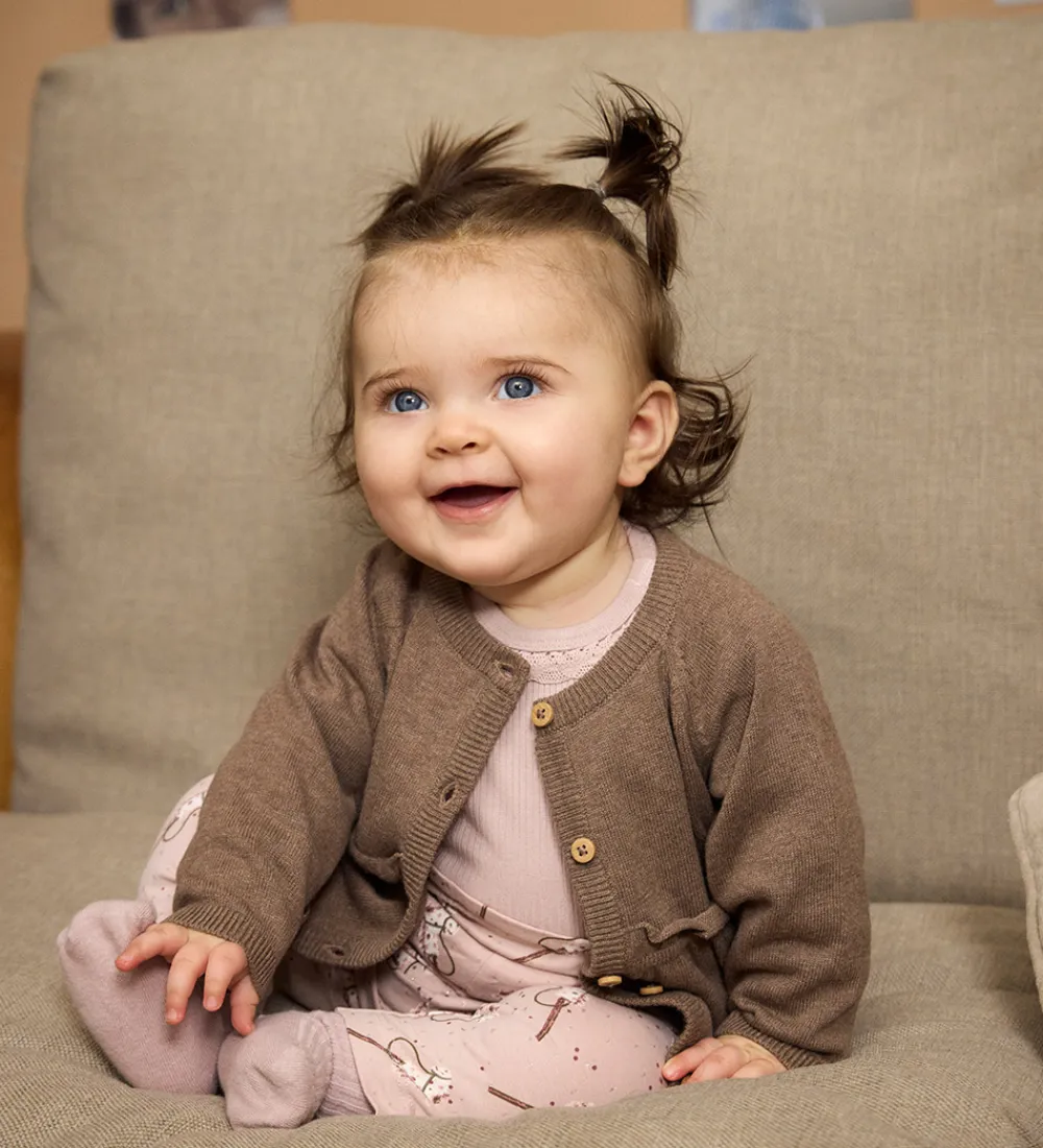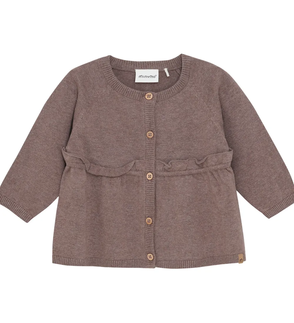 Charmerende Minymo cardigan i en varm brun nuance med lange ærmer. Cardiganen har en klassisk rund halsudskæring og knaplukning foran. Der er en fin flæse med rynkedetaljer over taljen, som tilføjer et elegant præg. Den har ribkanter i alle åbninger, som giver en god pasform. Minymo cardiganen er fremstillet af 80% bomuld og 20% uld.