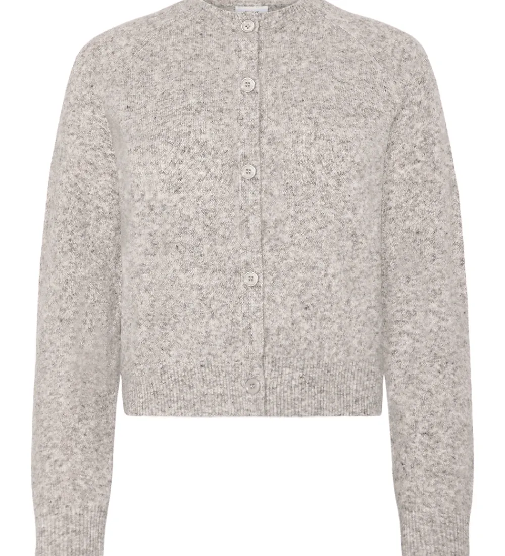 Flot Grunt cardigan i en beigemeleret strik. Cardiganen har en enkeltstående knaplukning foran og lange ærmer med en ribkant ved håndleddene. Grunt cardiganen har en rund halsudskæring, og den har en behagelig pasform, der gør den velegnet til mange lejligheder.