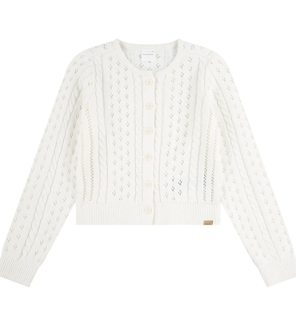 Charmerende Abercrombie & Fitch cardigan i hvid i en strikket kvalitet med et fint hulmønster. Denne cardigan fra Abercrombie & Fitch har lange ærmer og en rund halsudskæring. Den har brede ribkanter, som giver en god pasform, og den lukkes med matchende knapper foran.