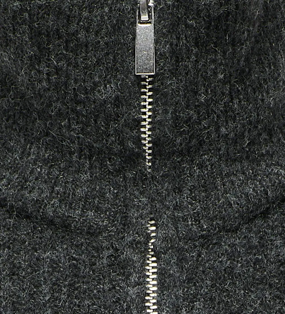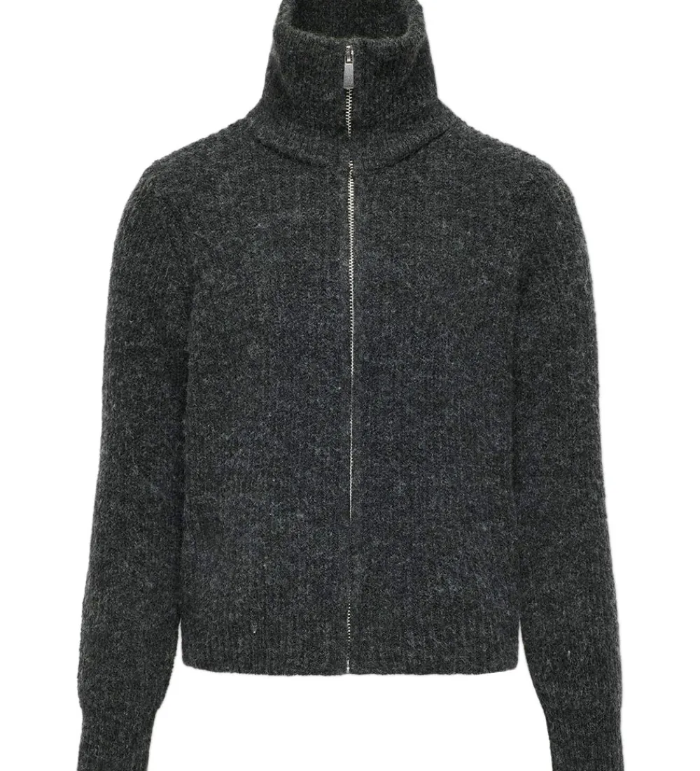 Stilren Kids Only Cardigan i en mørk grå farve med høj krave og lynlås foran. Denne cardigan har lange ærmer og tilfører varme til det kolde vejr.