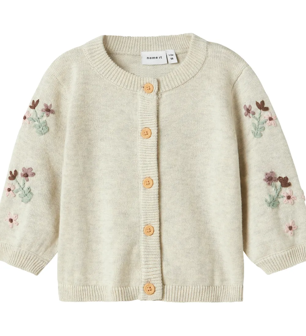 Smuk Name It cardigan i en lys beige nuance og i en strikket kvalitet. Cardiganen har lange ærmer med delikate blomstermotiver broderet på. Denne Name It cardigan er udstyret med en rund halsudskæring. Den har ribkanter ved hals, ærmer og bund, samt knaplukning foran med fine træknapper. Pasformen er afslappet og komfortabel, hvilket gør den velegnet til mange forskellige anledninger.