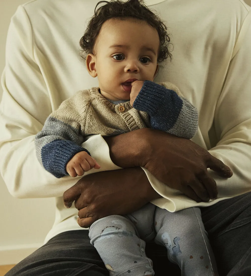 Stilfuld Name It cardigan med brede, vandrette striber i beige og blå nuancer.