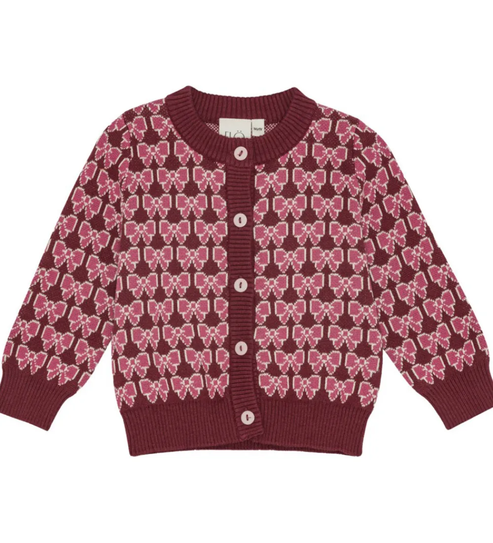 Flot Flöss cardigan i en dyb bordeauxrød med et flot mønster af lyserøde sløjfer.