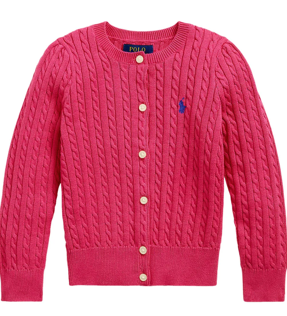 Smart Polo Ralph Lauren cardigan i pink i en strikket kvalitet med et flot, snoet mønster, og i venstre side er der broderet et lille, blåt logo.