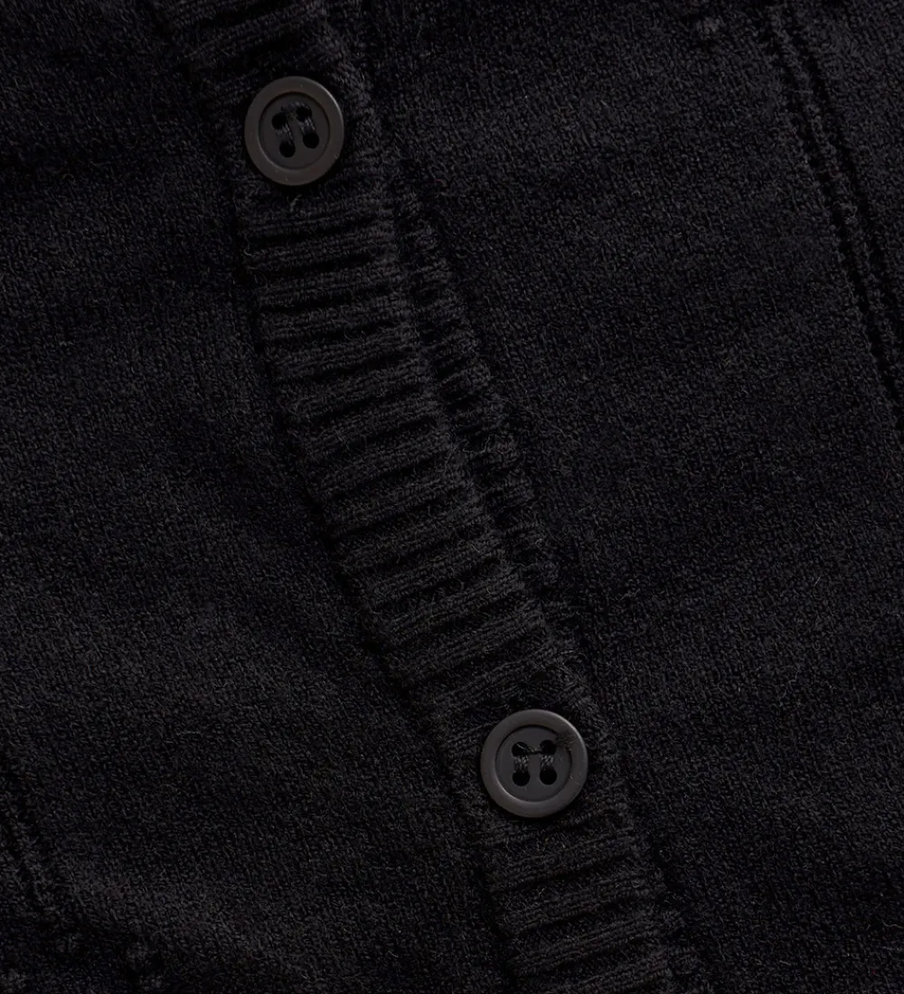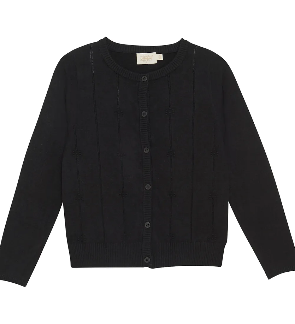 Stilfuld Creamie cardigan strikket i en klassisk sort nuance. Creamie cardiganen har lange ærmer og en flot ribkant ved halsudskæringen, ærmerne og bunden. Foran er der en knaplukning med matchende sorte knapper. Cardiganen har et diskret hulmønster, der løber lodret, hvilket tilføjer et dekorativt touch til designet.
