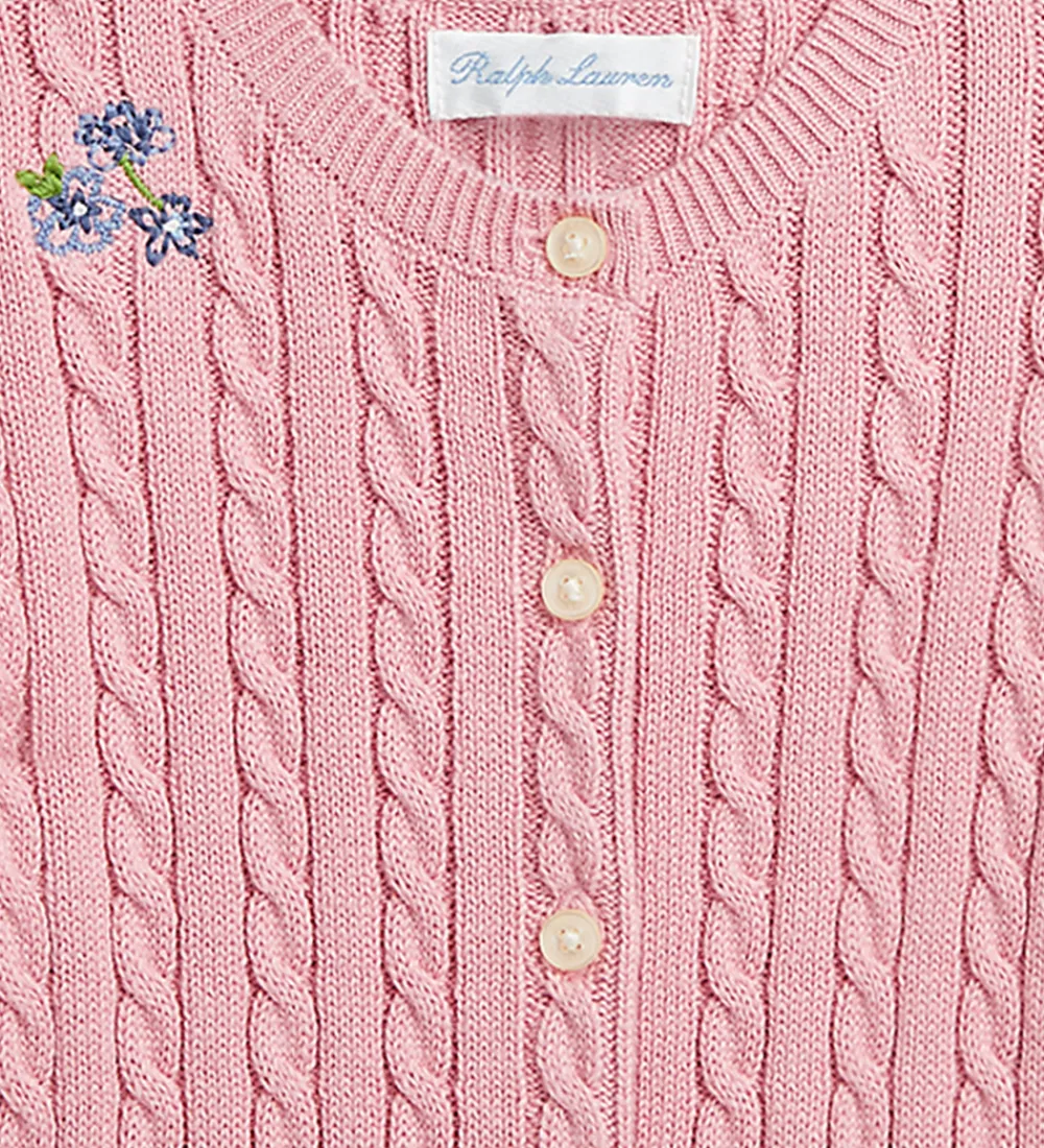 Sød Polo Ralph Lauren cardigan i rosa strik med et flot, snoet mønster, og foran højre skulder og nederst i venstre side er der broderet blå blomster.