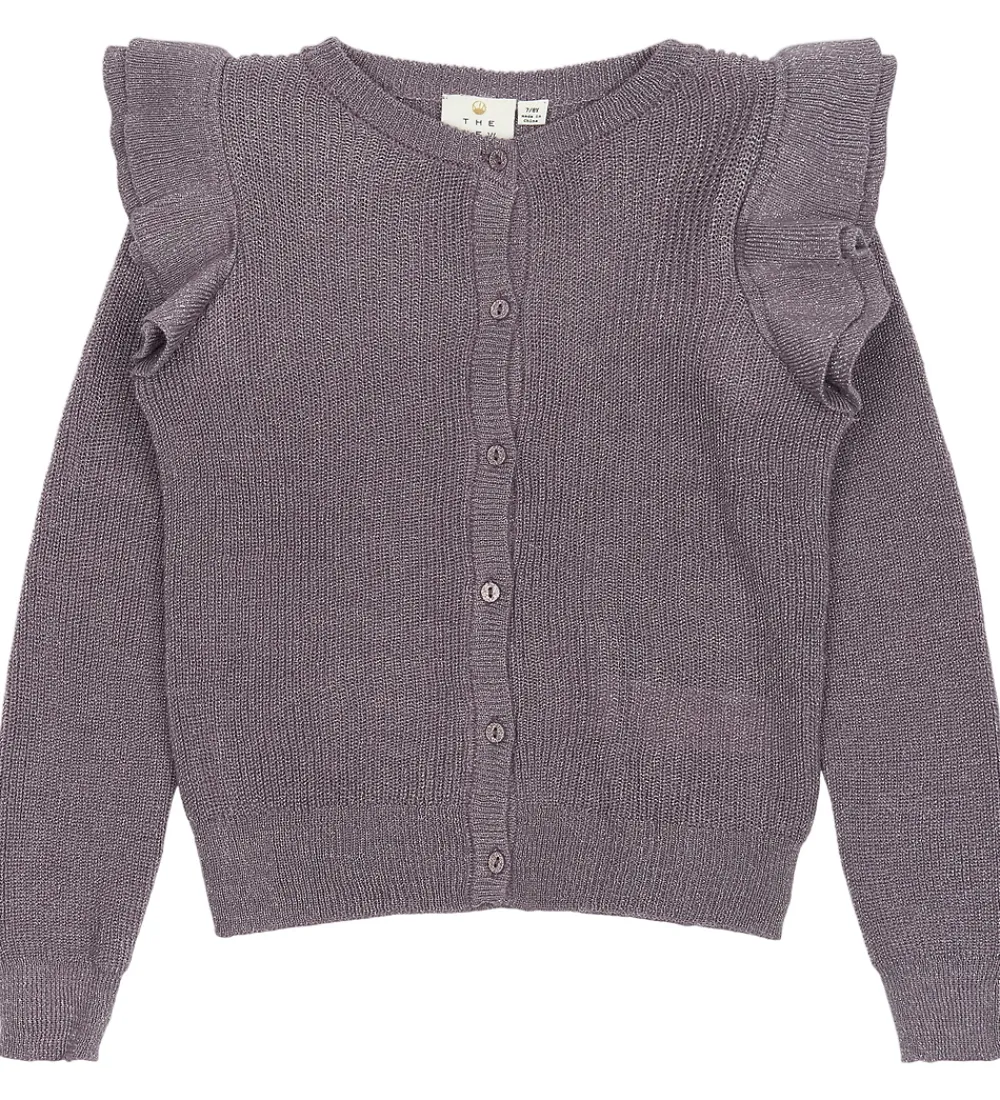Sød cardigan fra The New i en smuk lilla ribstrik med sølvglimmer samt dekorative flæser over skuldrene. Cardiganen fra The New har en gennemgående knaplukning fortil med matchende glimmerknapper.
