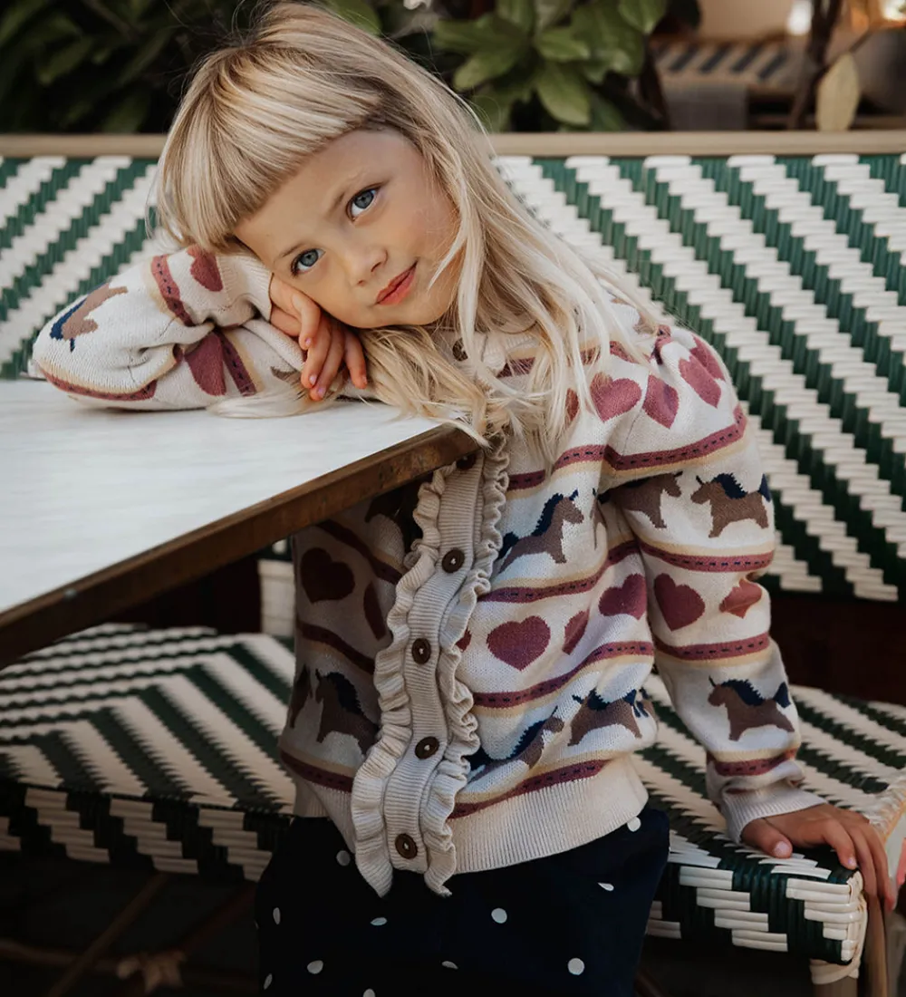 Charmerende Fliink cardigan i lys beige med print af heste og hjerter i rosa, brune og blå nuancer. Cardiganen har en strikket struktur med en rund halsudskæring og lange ærmer med rynker ved skuldrene. Fortil er der en gennemgående knaplukning med flæsekanter.