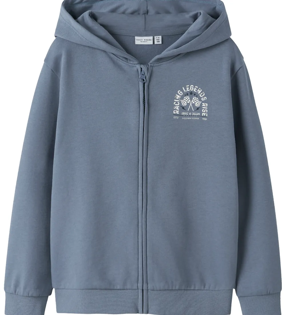 Smart Name It cardigan i støvet blå sweat med et print af to målflag og teksten “Racing Legends Rice” i hvid på venstre bryst. Name It cardiganen har en praktisk hætte og en lynlåslukning foran. Den har lange ærmer med ribkanter, og indvendigt er der blødt, børstet bomuld.