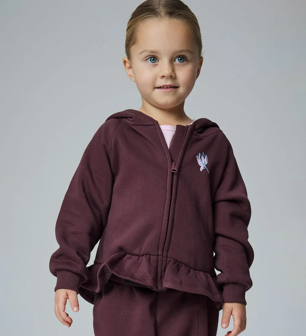Flot Name It cardigan i vinrød med et lille print på venstre bryst af en blomst i blå og rosa. Cardiganen er lavet i en blød sweatkvalitet med en hætte og gennemgående lynlås fortil. Den har lange ærmer med ribkanter og en fin flæsekant nederst. Indvendigt er der blødt, børstet bomuld.