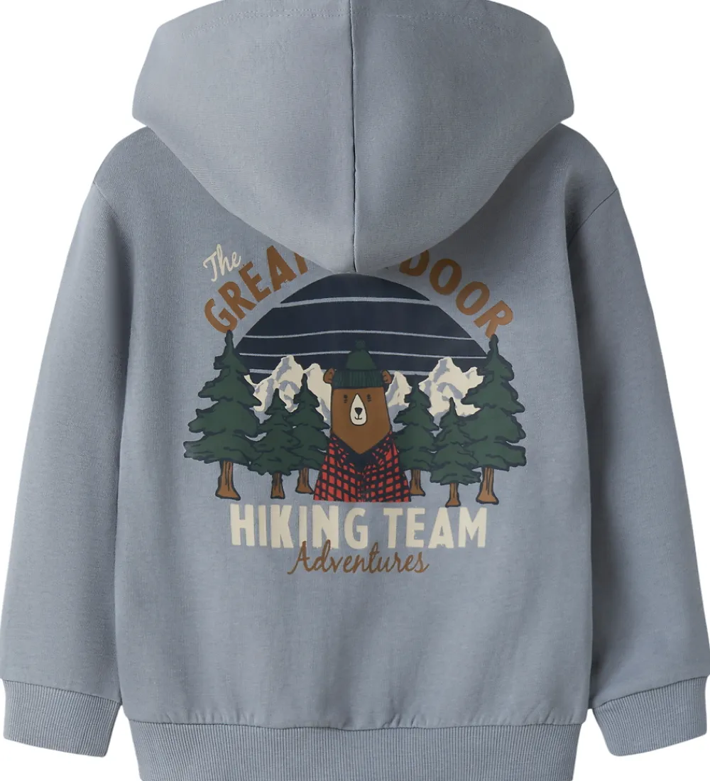Skøn Name It cardigan i støvet blå med et lille print på venstre bryst af en bjørn med en bluse og hue på samt tekstprint. Cardiganen er i en lækker sweatkvalitet med en fastsyet hætte, lange ærmer og gennemgående lynlås fortil. Den har ribkanter i alle åbninger, og indvendigt er der blødt, børstet bomuld.