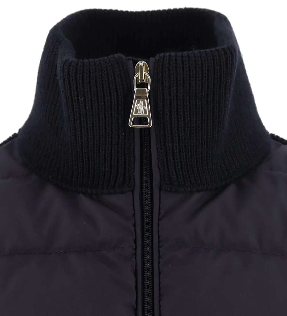 Moncler cardiganen er lavet i en strikket, ny og ren uldkvalitet, og hele fronten er lavet i en dunvatteret polyesterkvalitet med dekorative syninger, så den får et dunjakke-look.