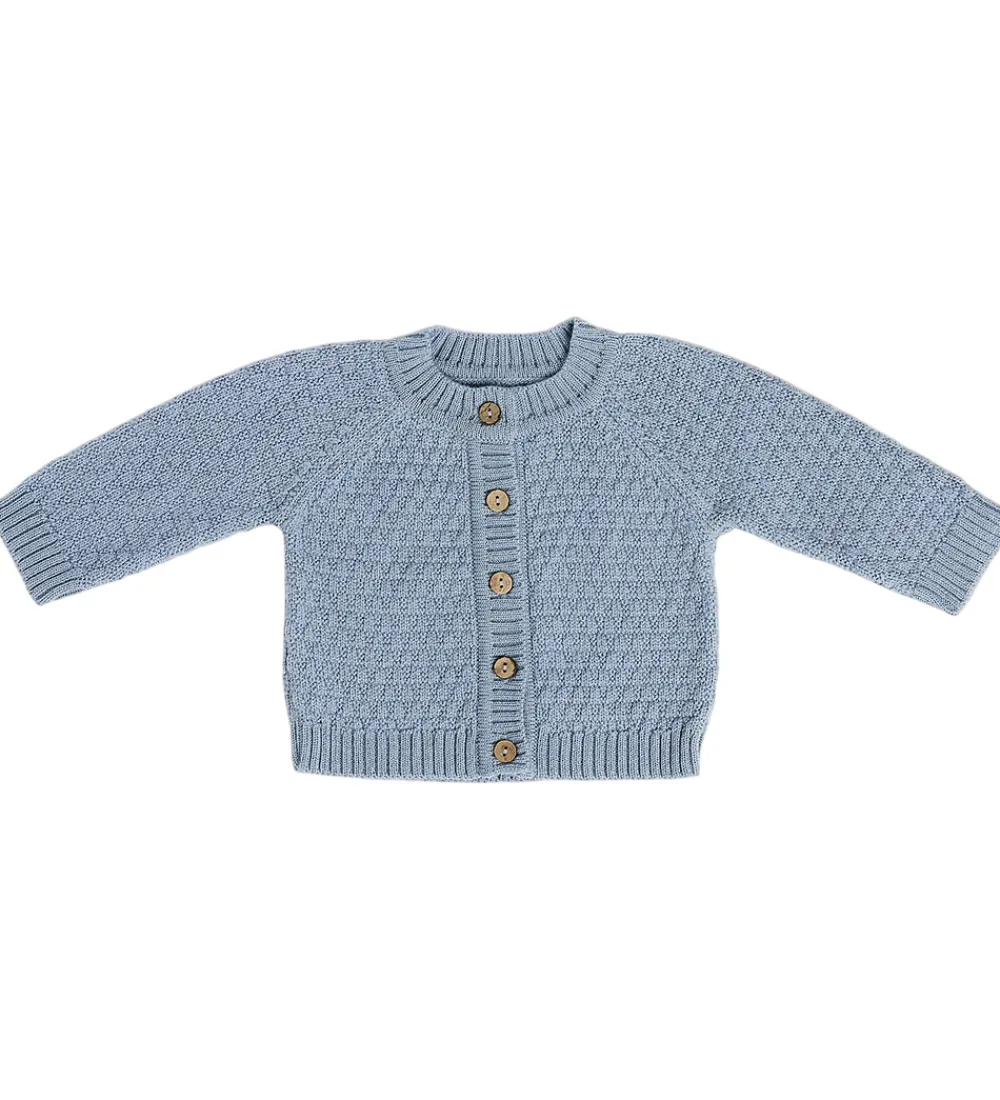 Dejlig Smallstuff cardigan i en blød blå farve. Smallstuff cardiganen har lange ærmer og en flot ribkant ved både hals, ærmer og bund. Knapperne foran er runde og matcher cardiganens harmoniske design. Pasformen er lige, hvilket giver et klassisk udtryk. Cardiganen er lavet i en strikket kvalitet af blødt merinould.
