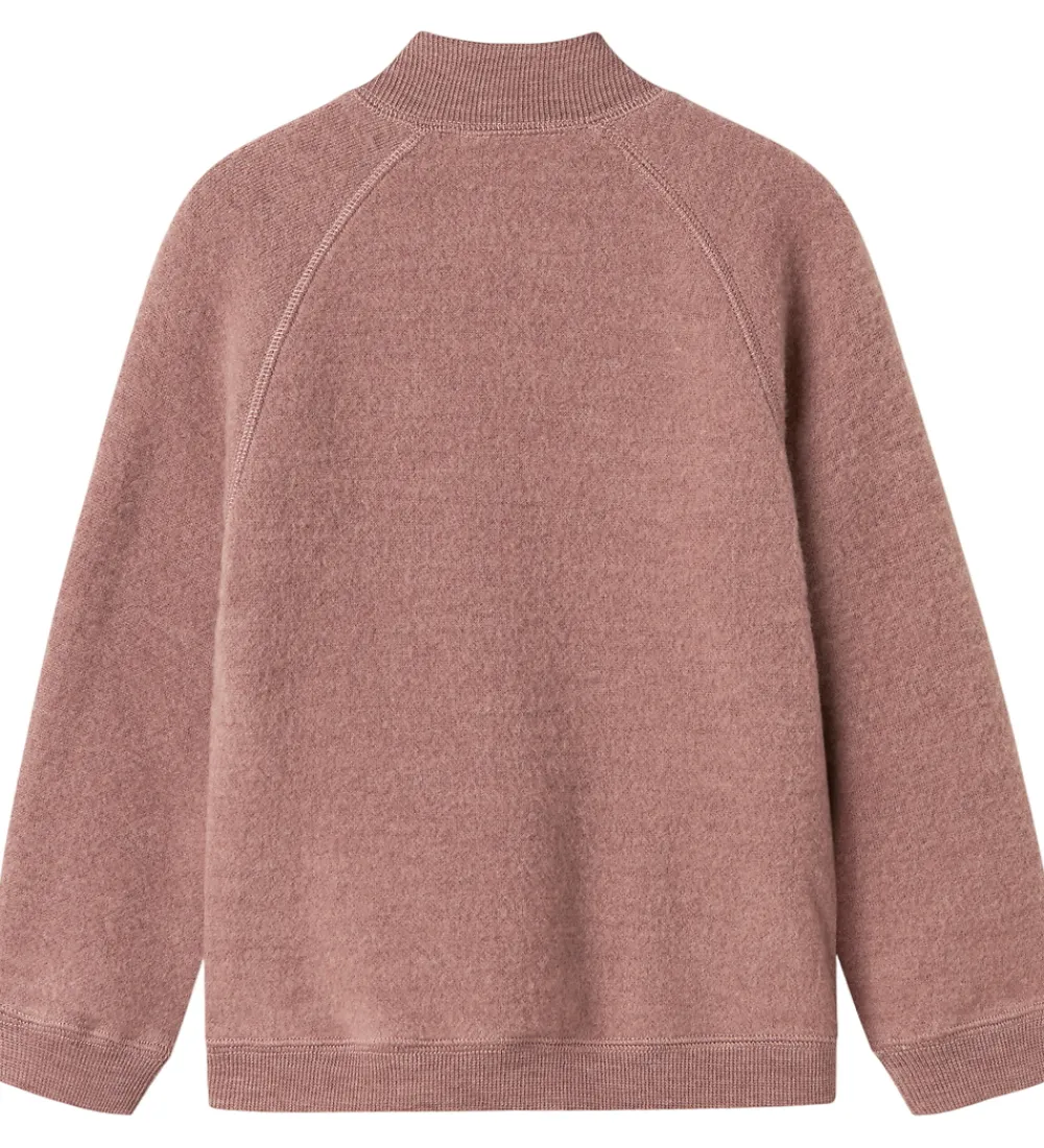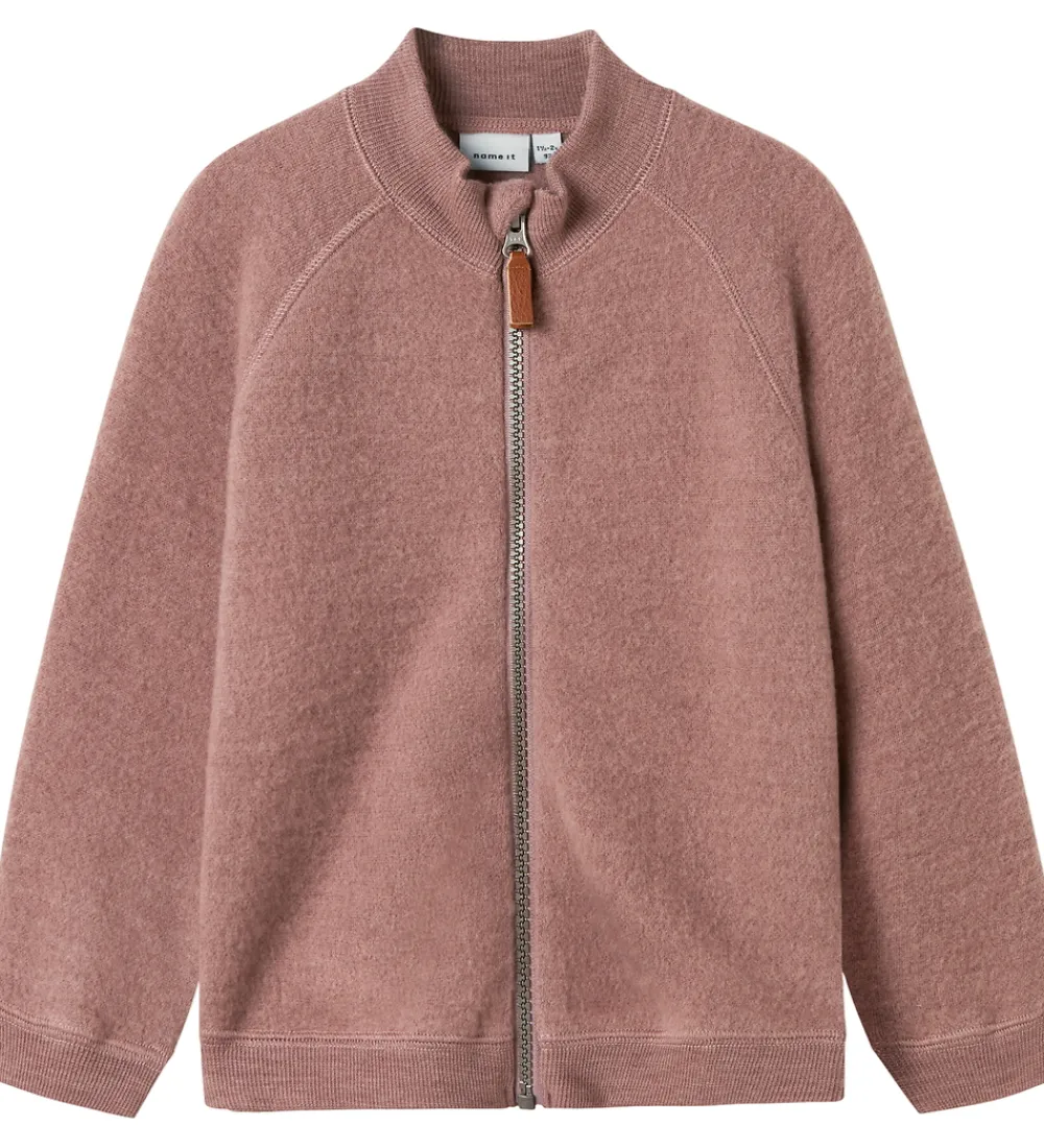Name It cardiganen har lange ærmer, og i alle åbninger er der brede ribkanter. Cardiganen har en gennemgående lynlås fortil, med hagebeskytter og indvendig vindstolpe. Cardiganen er i lækkert fleece af merinould.