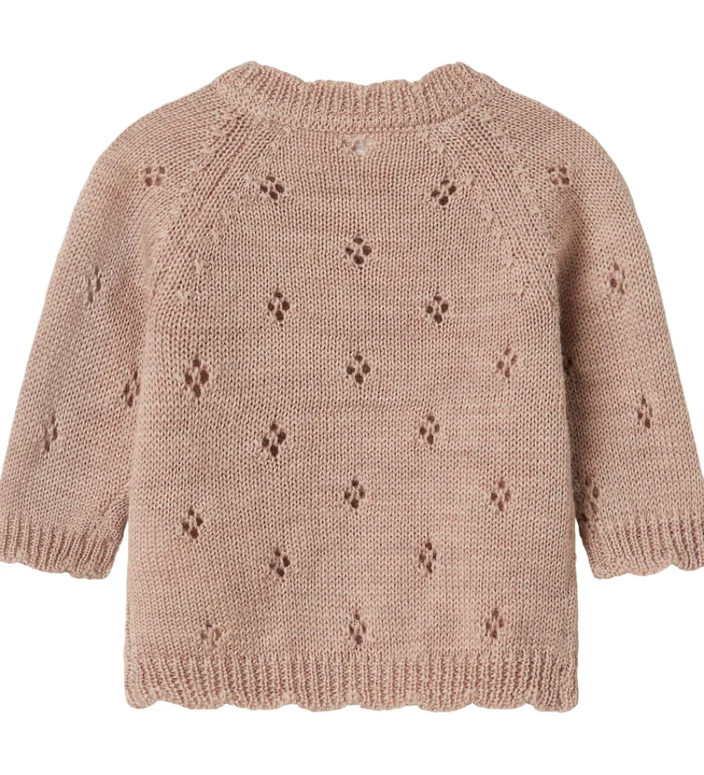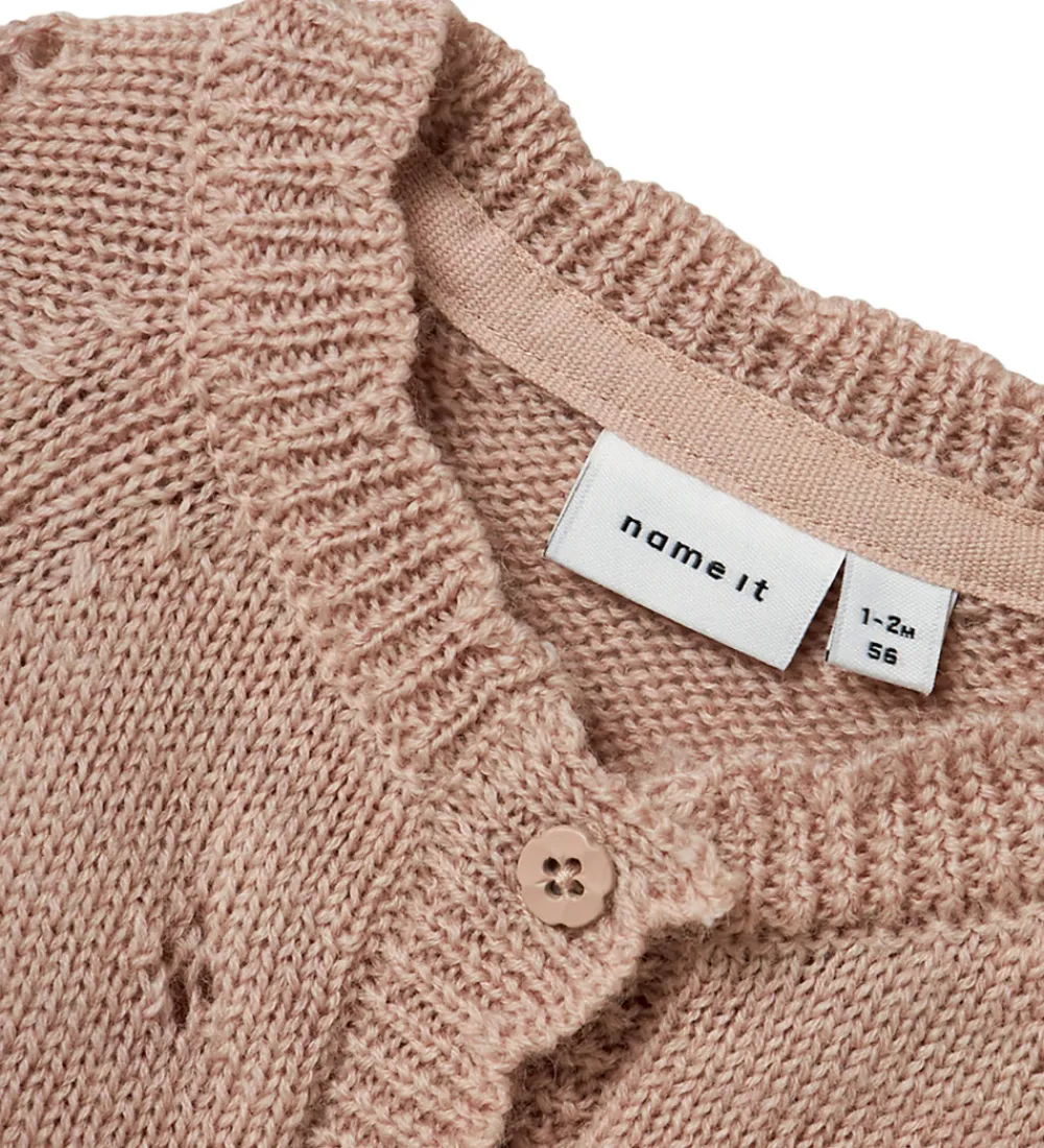 Smuk Name It cardigan i en sart, rosa nuance med et delikat hulmønster. Cardiganen fra Name It har lange ærmer og en rund halsudskæring, som tilfører et klassisk look. Den er udstyret med fine knapper langs fronten og har en blød ribkant ved ærmerne og nederst.