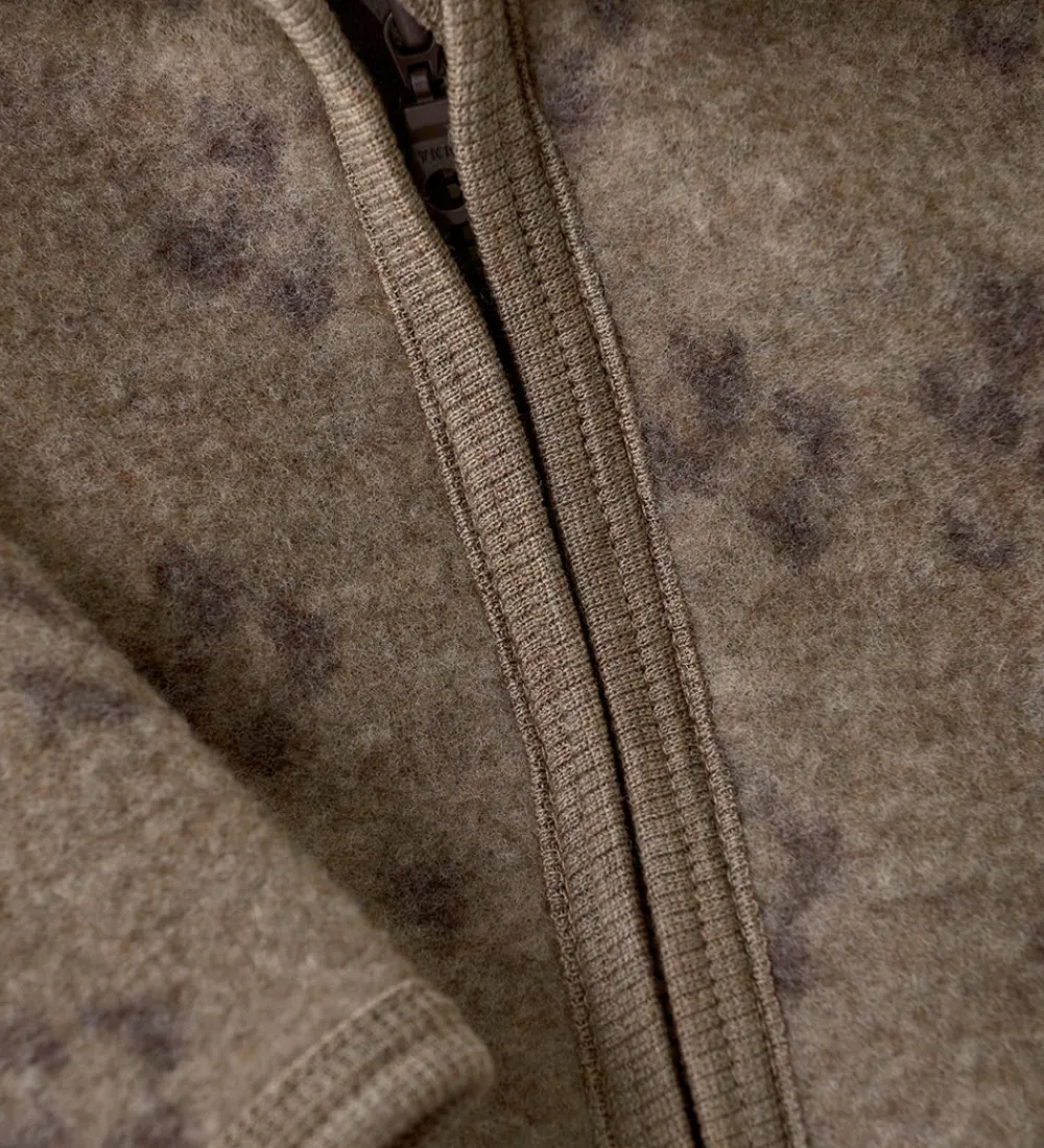 Lækker Huttelihut cardigan i meleret mørkebeige med grå detaljer af lunt uldfleece. I nakken er der en logopatch.