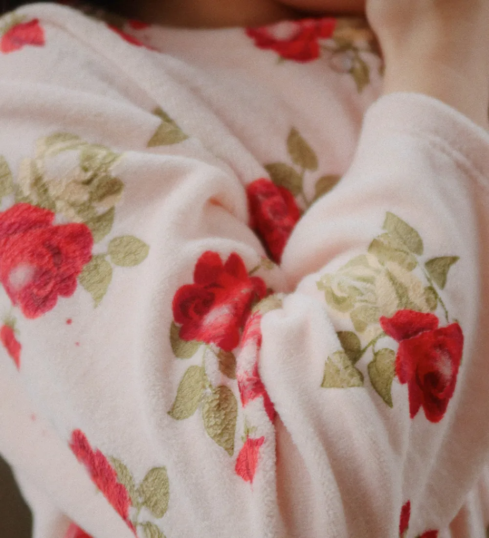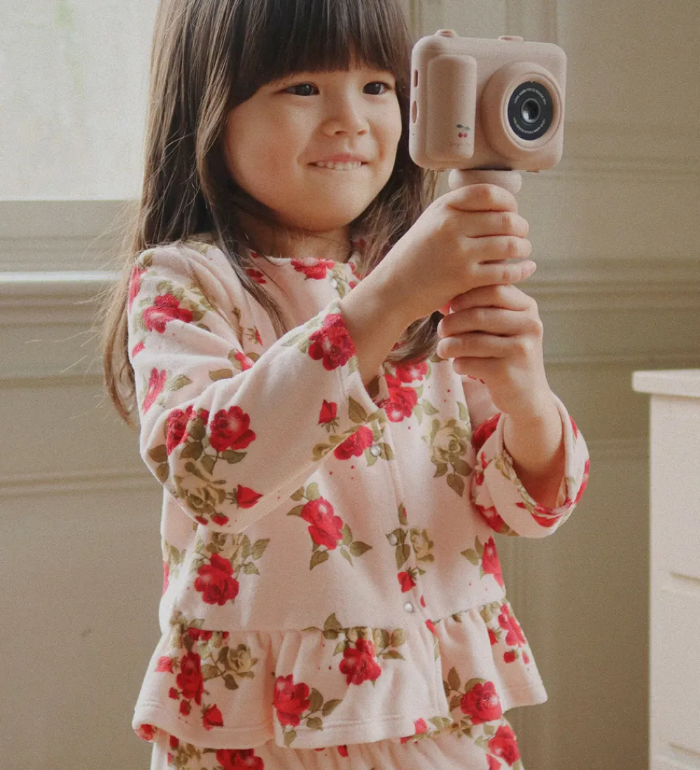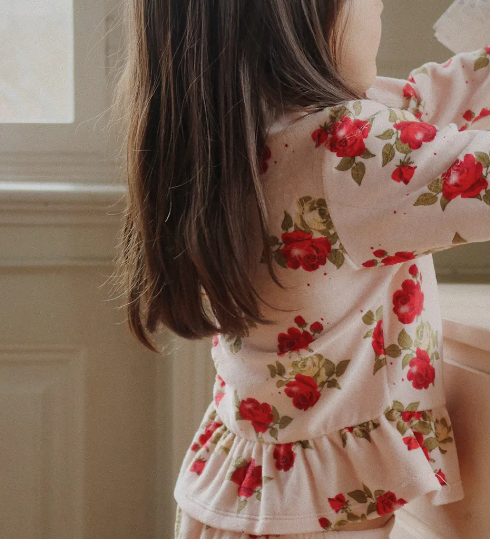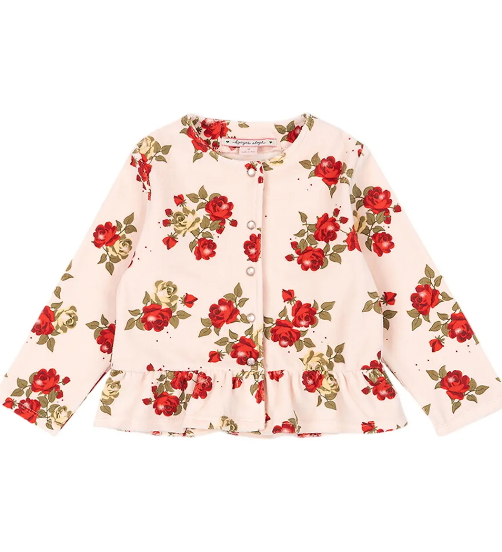 Smuk Konges Sløjd cardigan i lyserosa med et charmerende rosenmønster i røde og grønne nuancer.