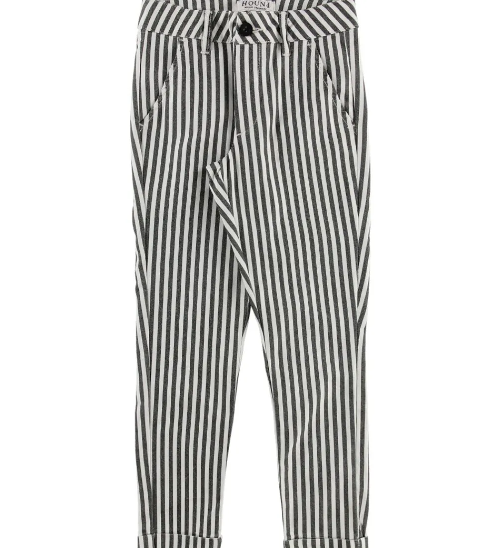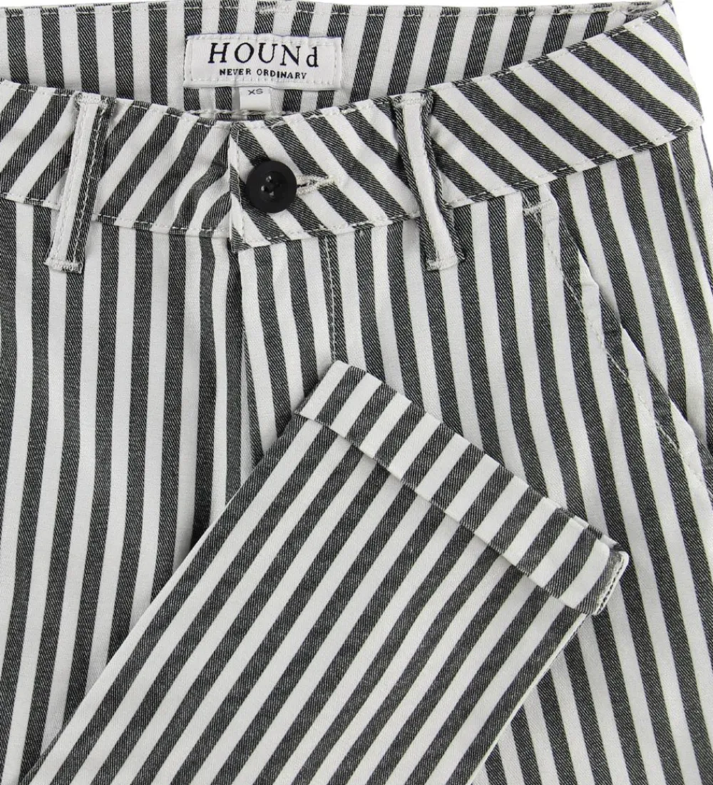 Hound chinosene har praktiske bæltestropper og pasformen kan justeres med indvendige knapper. Bukserne åbnes fortil med knap og lynlås. Fortil har bukserne gode dybe lommer i hver side, og paspoleret lommer bagpå. Bukserne er pyntet med en smart ombuk omkring anklerne.