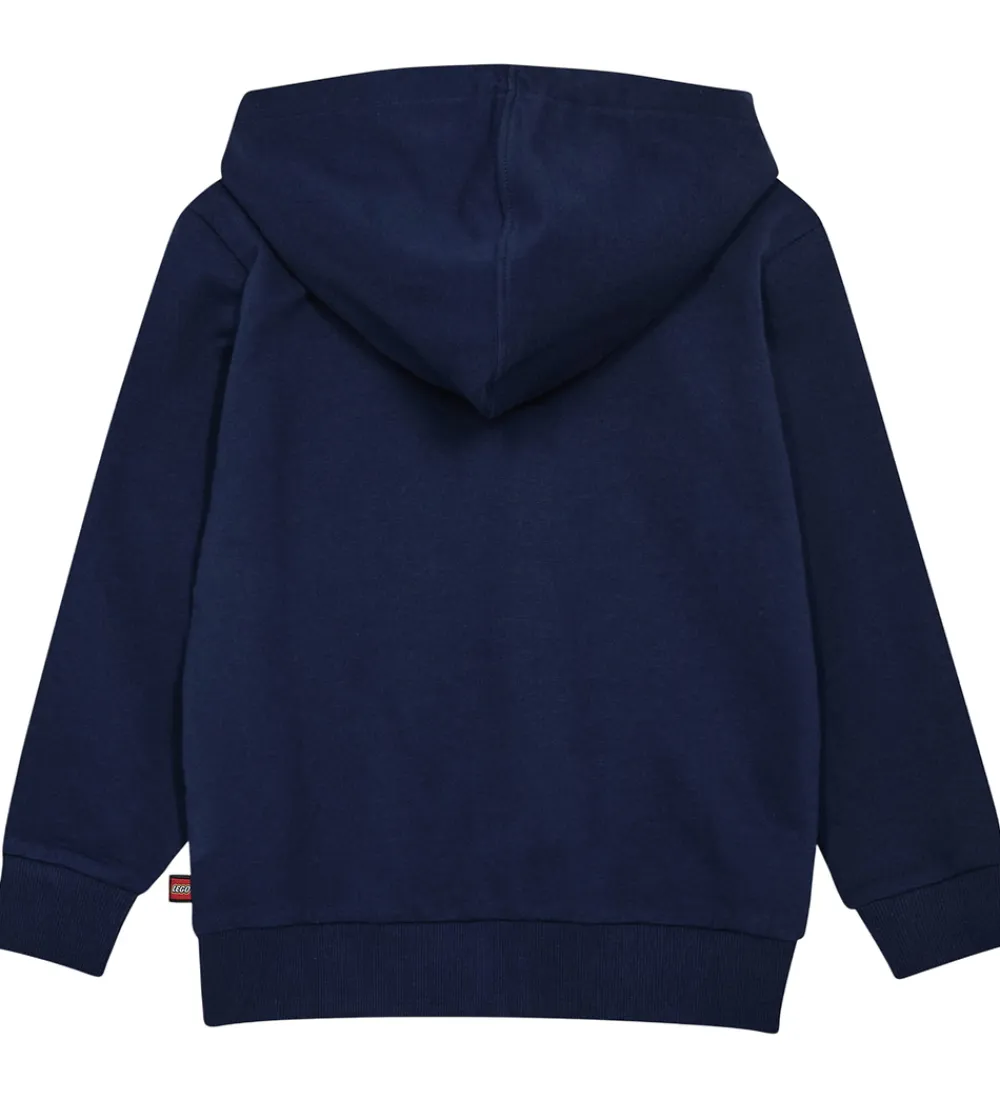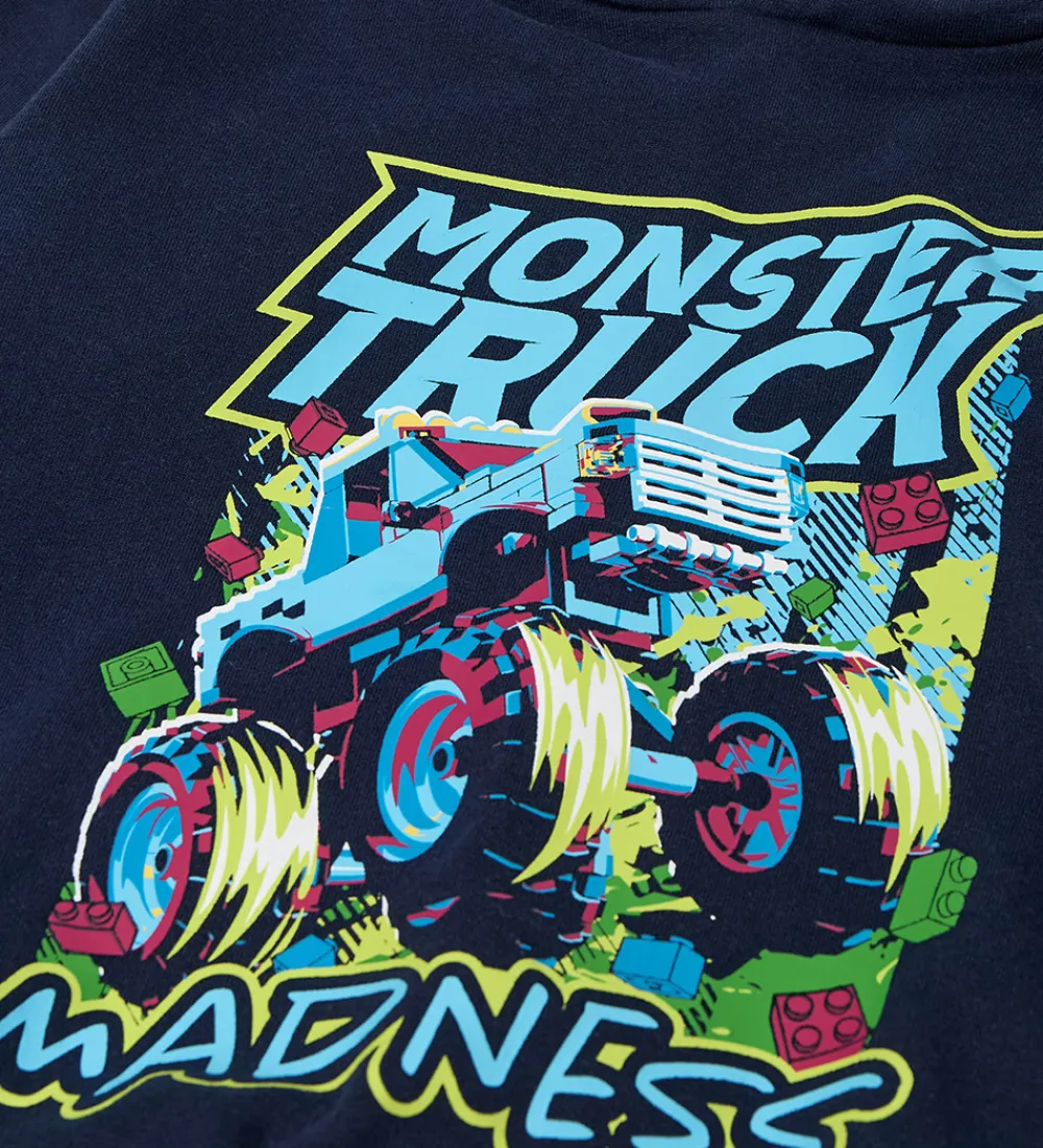 Sej hættetrøje fra LEGO® Wear City i mørkeblå og med et farverigt monstertruck-print på fronten. Hættetrøjen er med blød, børstet bomuld indvendigt.