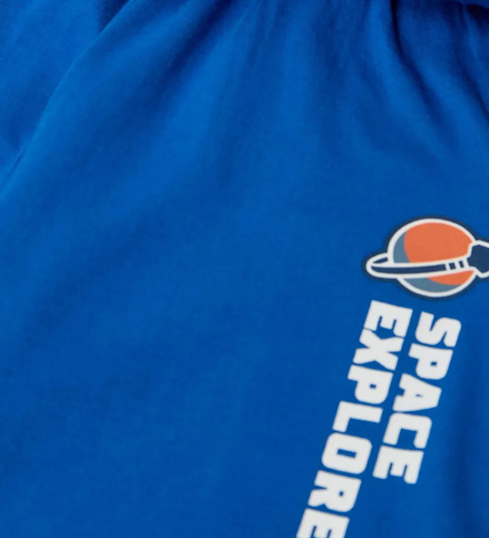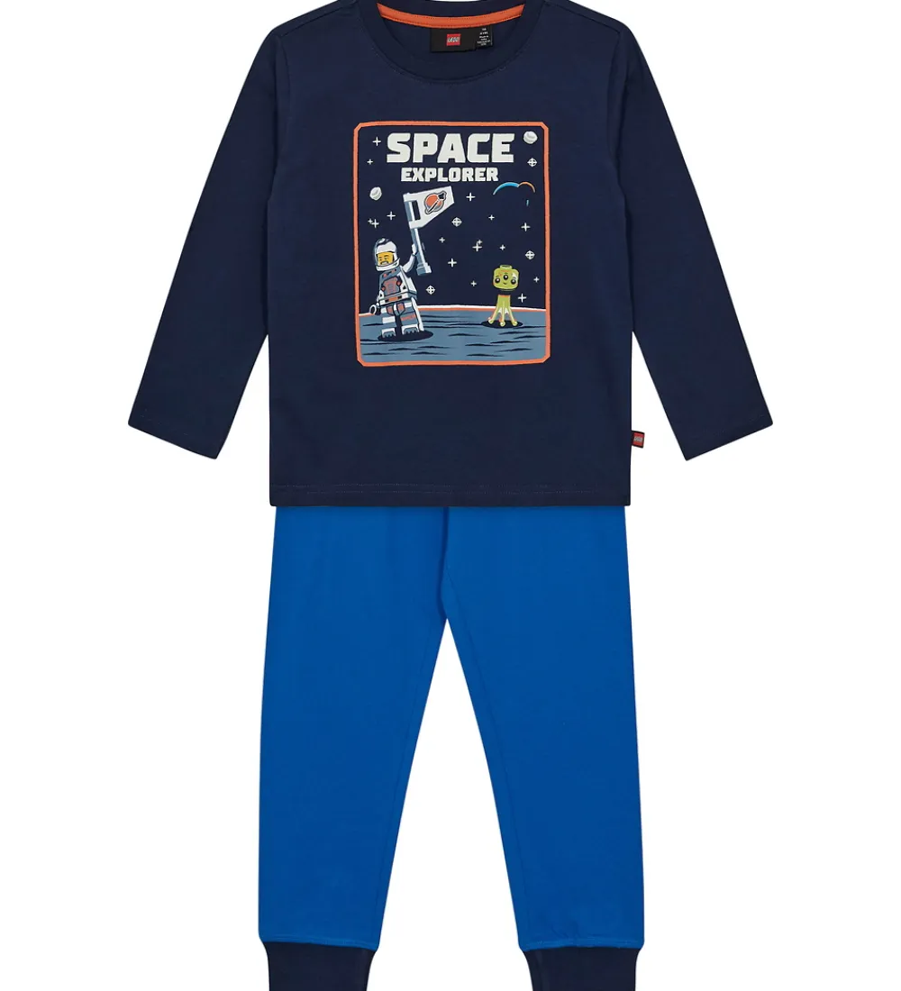 Lækkert LEGO® Wear City nattøj med en langærmet bluse i mørkeblå med et fedt Space Explorer-print. Bukserne er blå med mørkeblå ribkanter og har et hvidt tekstprint med en planet ovenover på det ene lår. Dele af printet lyser i mørke.
