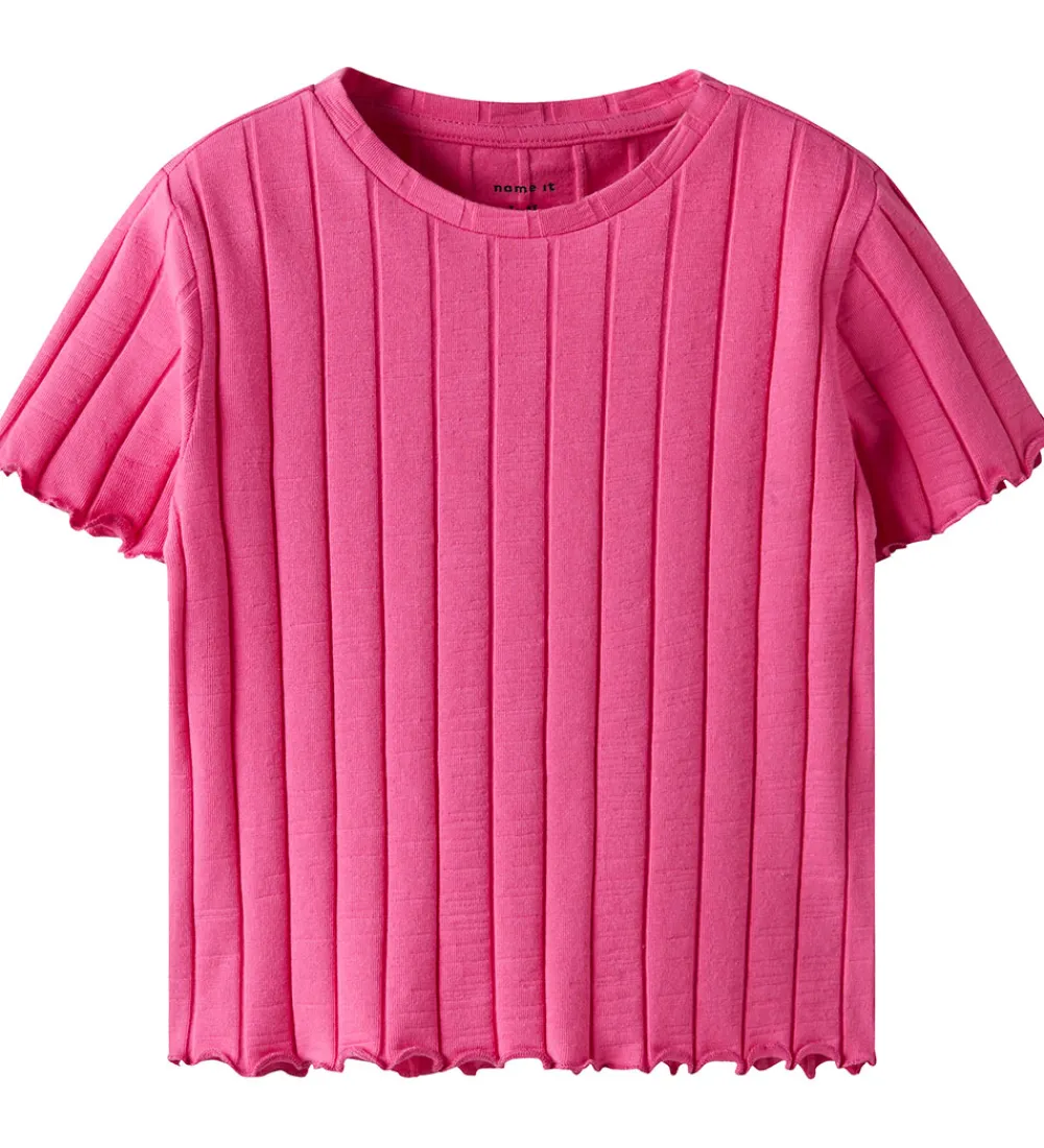 Charmerende T-shirt fra Name It i en tydelig pink nuance. T-shirten har korte ærmer og smart struktur, der giver et unikt look. Perfekt til varme dage eller som et farverigt indskud i garderoben.