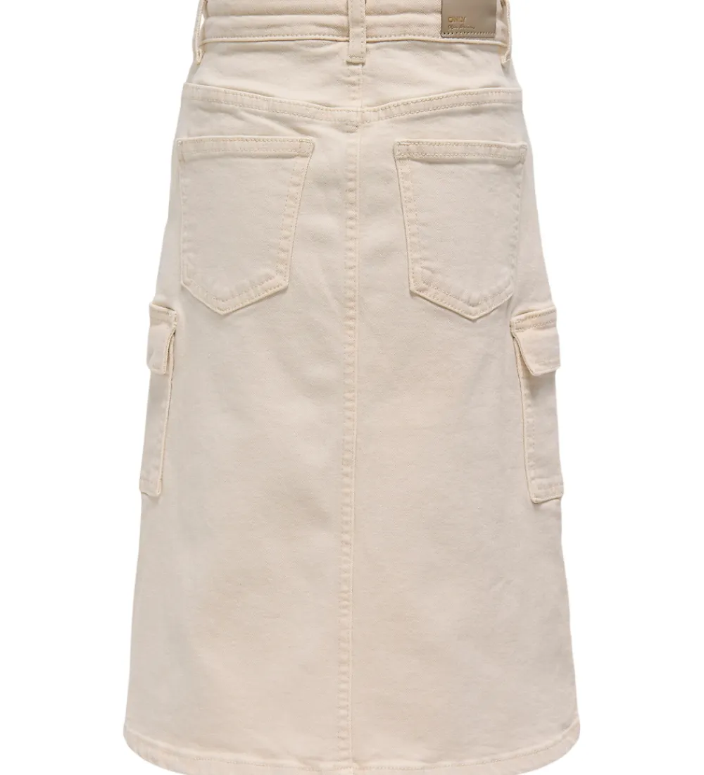 Smart Kids Only denimnederdel i lys beige. Kids Only denimnederdelen har elastik i taljen, som kan justeres med knapper indvendigt. Den lukkes fortil med en hægte og lynlås. Denimnederdelen har praktiske bæltestropper og en slids fortil. Den har tre lommer fortil, to på siderne og to baglommer.
