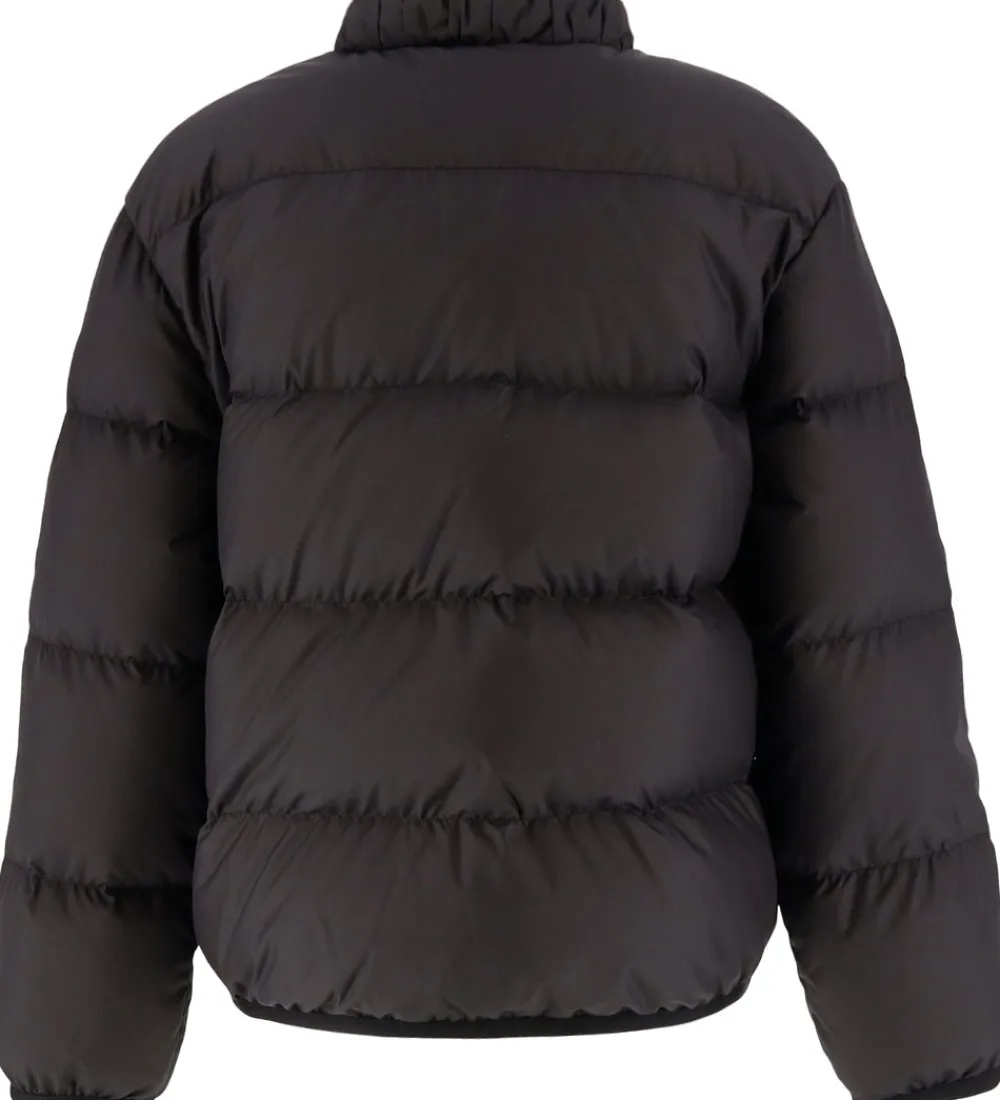 Smart Moncler dunjakke i ensfarvet sort, og øverst på venstre ærme er der et filt-mærke med et Moncler-logo.