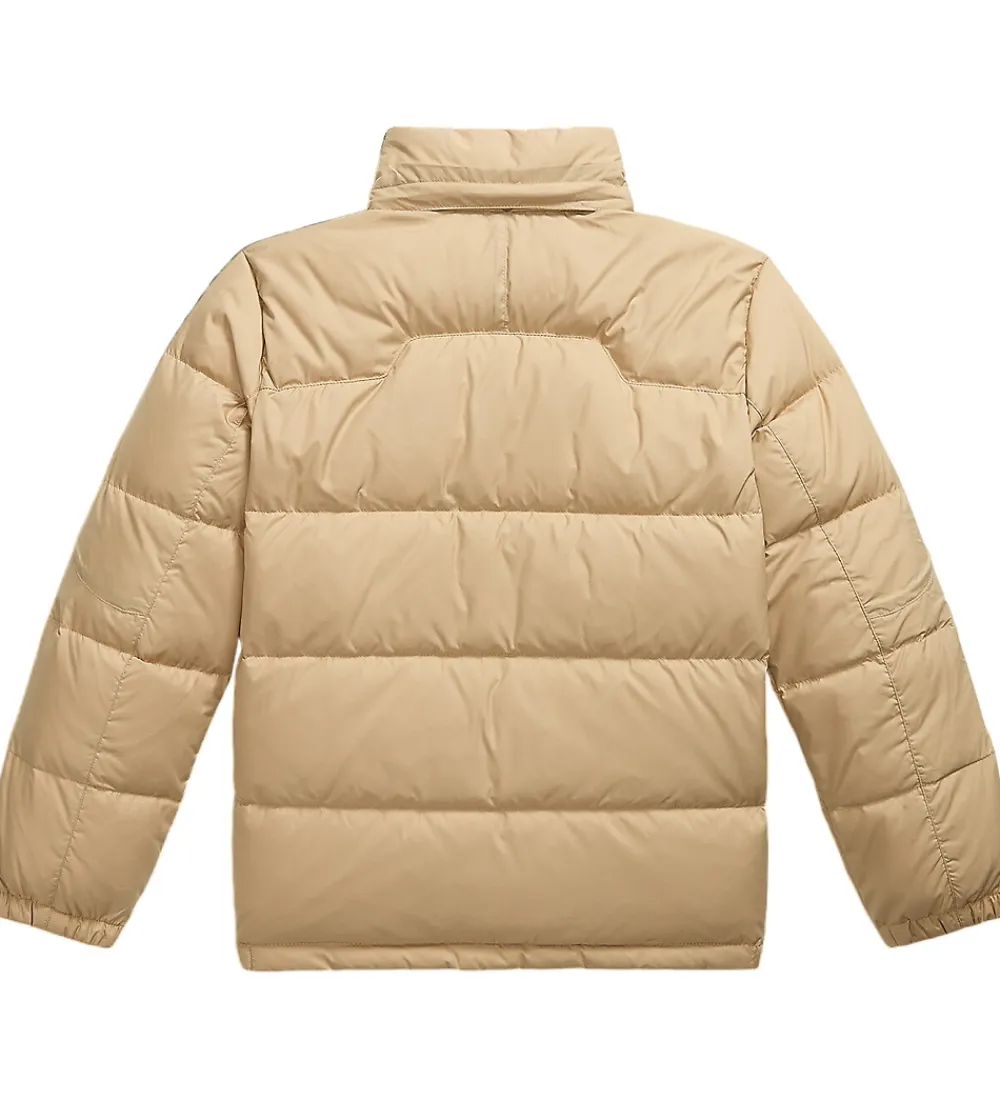 Skøn Polo Ralph Lauren dunjakke i ensfarvet beige med et lille, mørkegrønt logo broderet i venstre side.