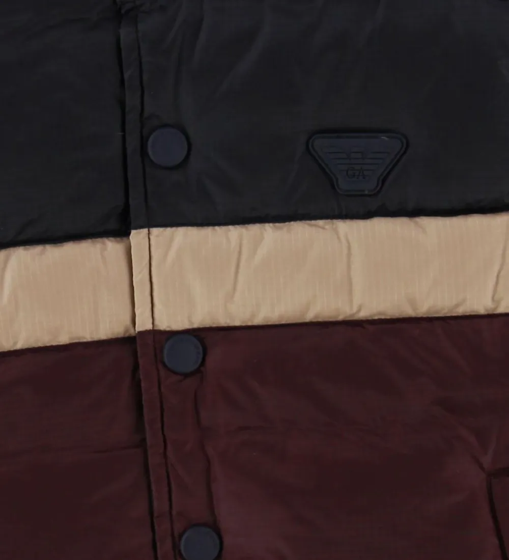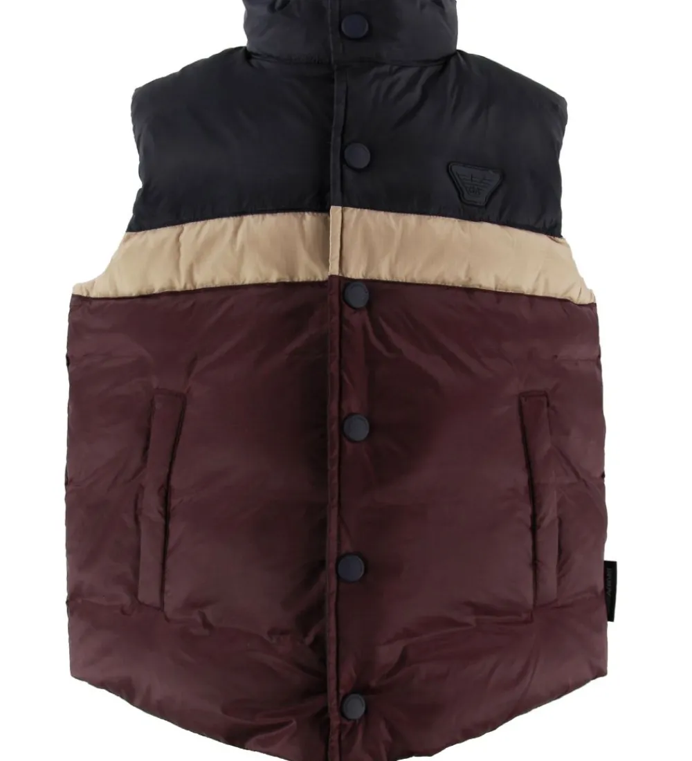 Flot Emorio Armani dunvest i bordeaux, og i toppen er den navy. Mellem de to farver er der en bred, lysebrun stribe. Fortil i venstre side sidder der et navy gummimærke med et logo.